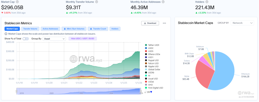 稳定币总市值收缩至2,960.5亿美元,环比上月同期微降0.6%,反映资金规模仍在萎缩;月度转账量飙升至9.31万亿美元,环比上月同期剧增41.21%,存量资金周转率(转账量/市值)攀升至31.4倍。