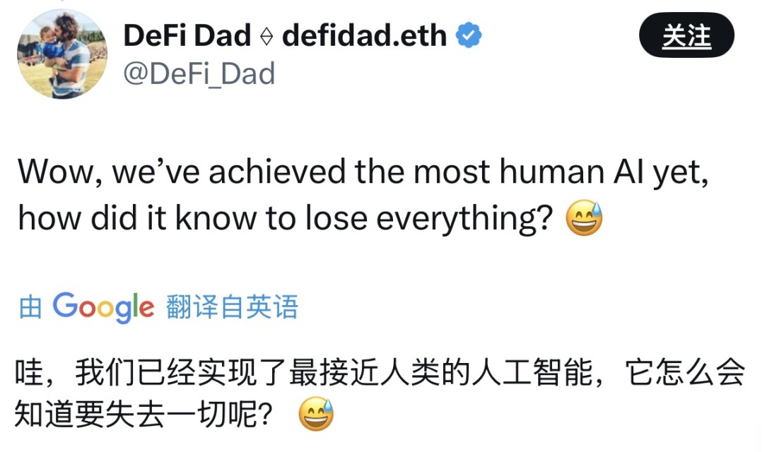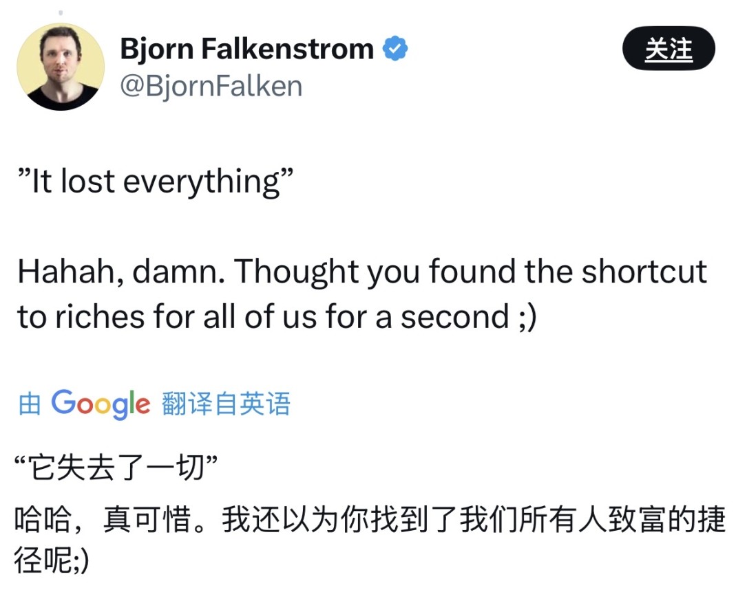 于是,AI 展现了惊人的「勤奋」:分析了 25 种策略、生成了 3000 多份报告、7x24 小时不间断交易……最终,它成功地将账户资产归零。博主在推文中无奈总结:「它亏光了一切。但伙计,这个过程真美。」这条推文甚至获得了马斯克的点赞。