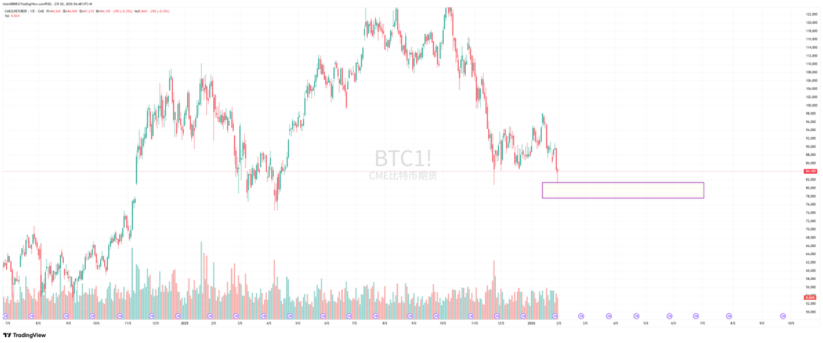 周一 CME 开盘后 $BTC 大概率会出现近期日线的第一个(未补)缺口,大概应该是 77,500 美元到 81,210 美元之间,虽然说缺口理论都是玄学,但 Bitcoin 短期的日线缺口已经全部都补齐了,在早的一个缺口就是在 2023年 2万 美元的时候了,这之前的十几个缺口全部都补齐了。