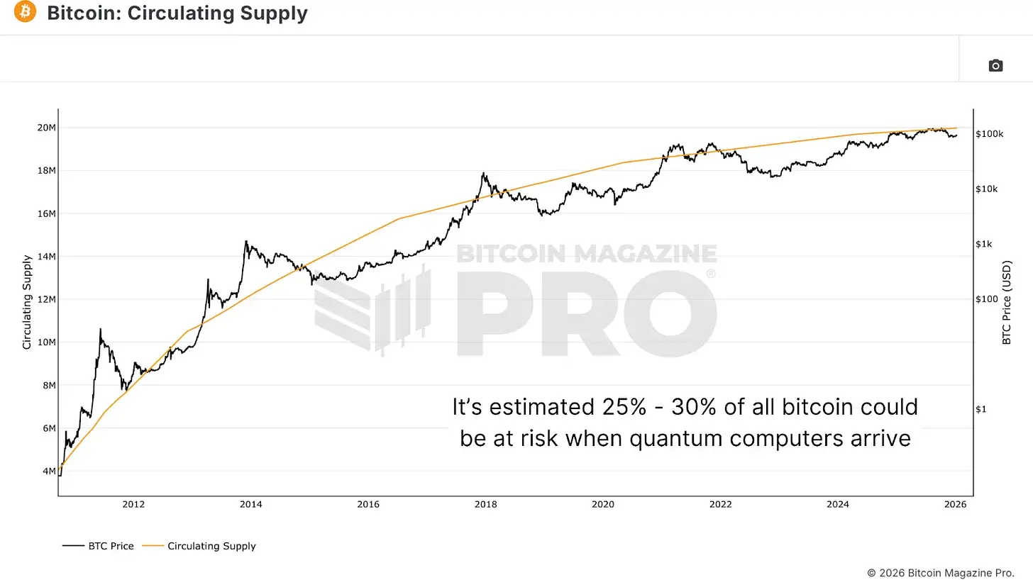 比特币正面临其首个真正的生存威胁,这并非来自政府禁令或市场崩溃,而是来自量子计算。存放在中本聪钱包中的 110 万枚比特币(价值约 1000 亿美元),以及占流通总量约 25% 的比特币,目前都暴露在极易受到量子攻击的老旧加密密钥之下。当量子计算机成熟时——无论是 5 年还是 25 年后——这些比特币将被破解。