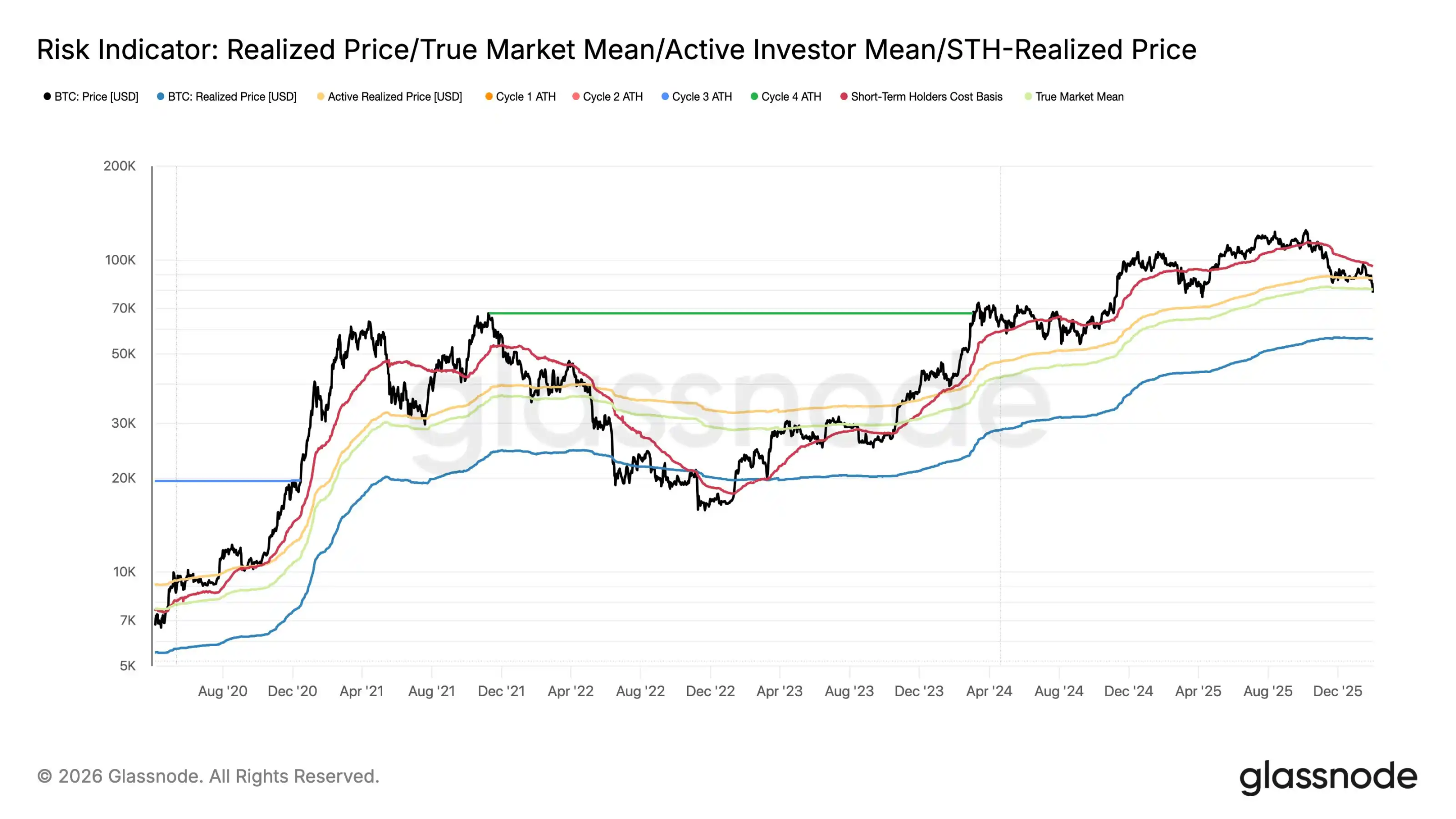 比特币跌破 7.8 万美元,glassnode 更新比特币链上关键价格分布如下:STH(短期持有者)成本基础,反映最近几个月新进场买家 / 交易者的平均持仓价格是 9.54 万美元。