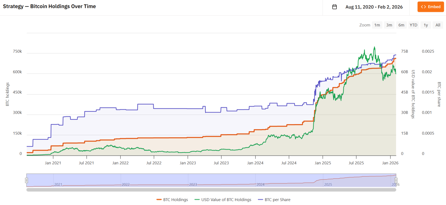截至 2 月 2 日,比特币知名囤币大户 Strategy 持仓总价值约 542 亿美元,持有 712647 枚 BTC,其平均持有成本约为 76040 美元。