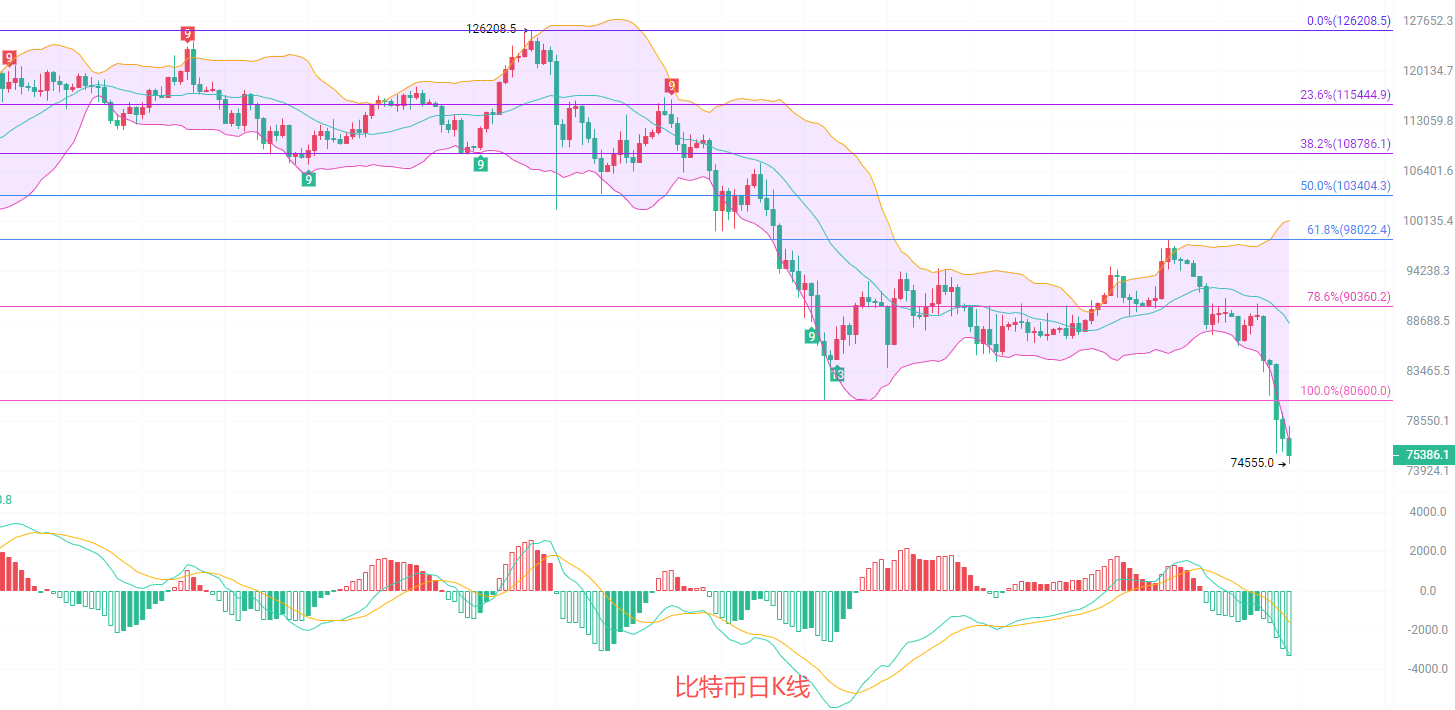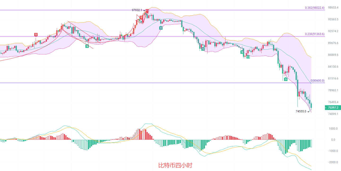 日K线发稿前最高78230,最低74600,EMA趋势指标向下扩散空势不变,EMA15快线已经跌破了85000,MACD连续缩量增筹,DIF和DEA向下扩散开口,布林带下轨关注75500还在破新低,整体趋势上处于大空趋势,但是RSI已经抵达了极端超卖,也就是说行情有反弹的需求,这种行情随时出现背离,主力高度控盘期间跟游资已经没有关系了,