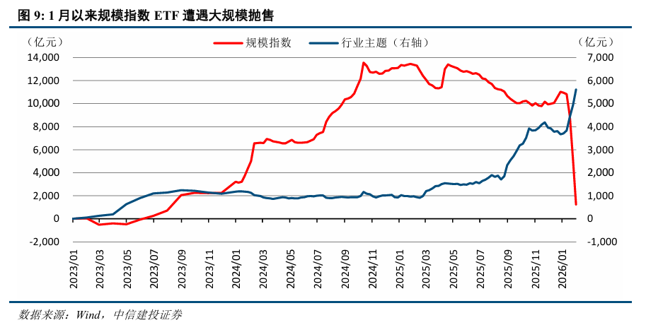 宽基ETF抛售潮还会持续吗?我们认为下周宽基ETF抛售规模有望明显下降甚至完全停止。其原因有:1)根据我们的监测数据,市场情绪已经出现明显降温,前期ETF抛售对市场流动性的收紧效果已经开始显现;2)国际金银价格巨震,全球弱美元预期出现阶段性转折,市场避险观望情绪上升,叠加春节将至,资金避险意愿进一步上升,已经无需继续降温;3)汇金ETF规模已经减少约60%,后续仍需保留一定规模ETF作为后续调控工具。因此,对于A股市场来说,虽然短期仍面临情绪降温和回调压力,但随着ETF抛售的停止,市场有望企稳并为下一轮上行积蓄能量。