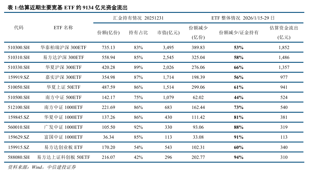 如果我们将视角集中到汇金持有的ETF品种近期动向上,可以看到约有53-66%汇金持有的沪深300ETF份额近期(1月15-29日)出现减少,约73-91%汇金持有的中证1000ETF份额出现减少,上证科创板50ETF份额减少比例甚至高达94%。估算资金流出规模约为9134亿。