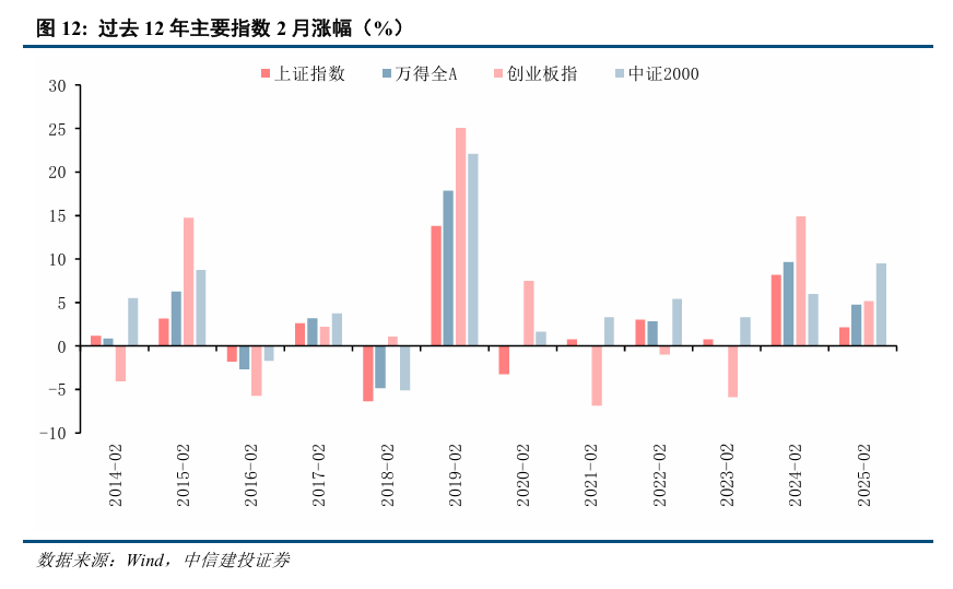 从季节效应上看2月通常胜率较高,赚钱效应较好:我们统计了过去12年主要指数的2月涨幅表现,可以看到2月上证指数和中证2000的胜率分别为75%和83%,万得全A和创业板指的胜率也达到了58%。从平均涨幅来看,中小盘风格和科技成长风格占优,中证2000和创业板指平均涨幅分别为5.18%和3.92%,上证指数和万得全A平均涨幅也达到2.00%和3.15%。总体来看,2月作为春季行情(春节后两会前)关键演绎期,投资者做多热情往往高涨,结合当前市场牛市氛围,预计春节后市场有望迎来新一轮上行。