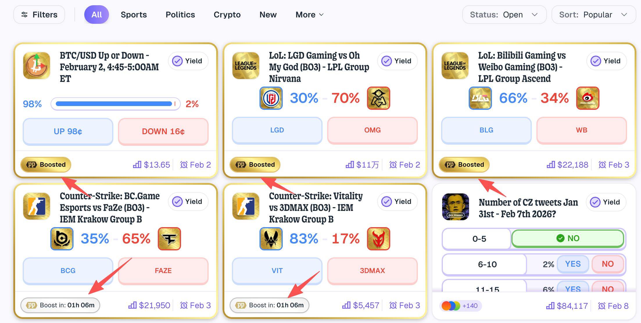 1 月 20 日,predict.fun 宣布上线 Boost 积分加成活动,标有 Boosted 金色徽章标志的事件会获得更多的积分(具体加成倍数未公布),多为体育赛事。
