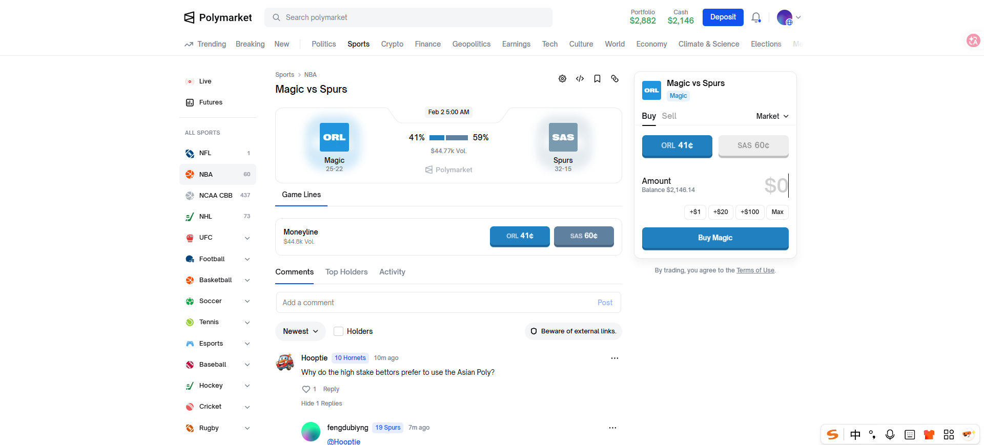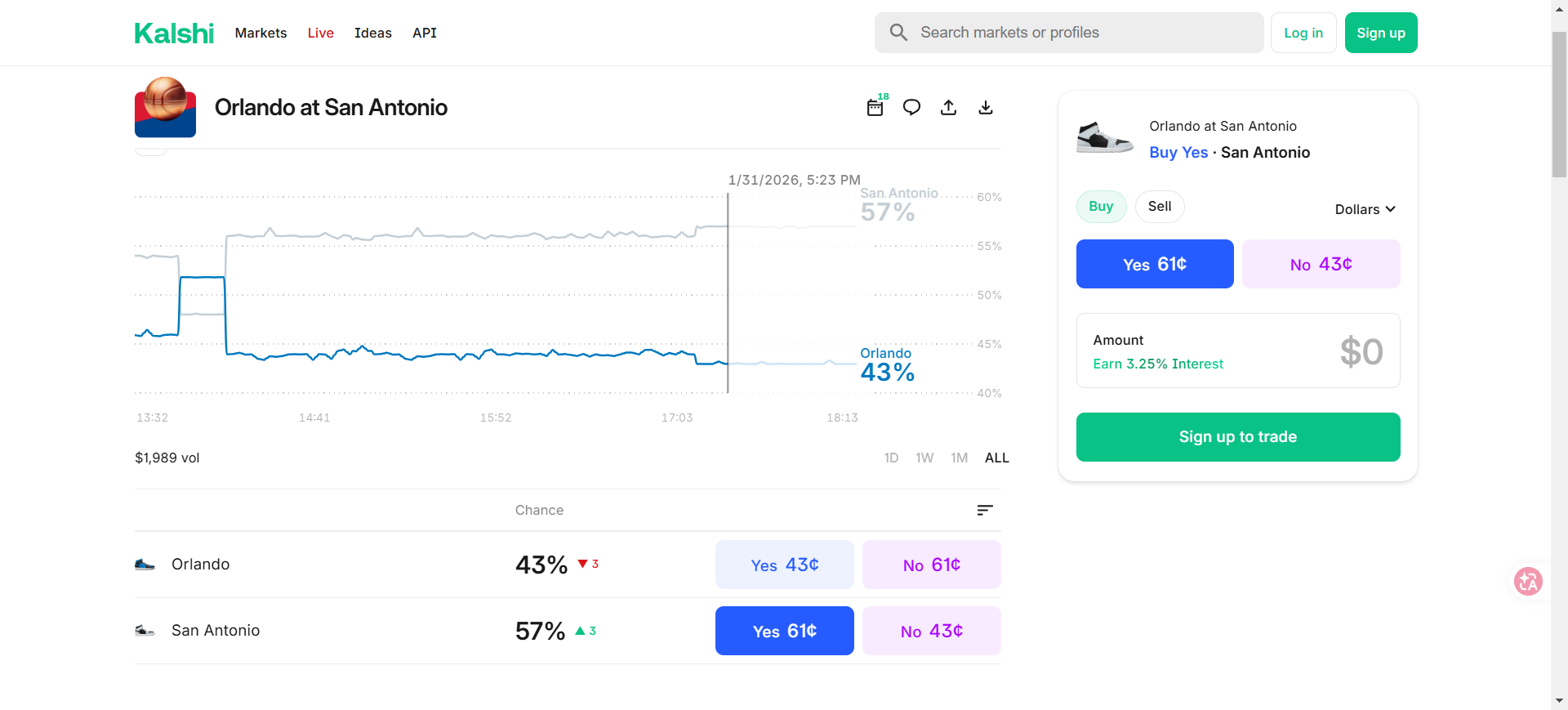 如果你分别在平台 B 买入魔术队获胜(41¢)和在平台 A 买入马刺队获胜(57¢),总成本 = 41¢ + 57¢ = 98¢。