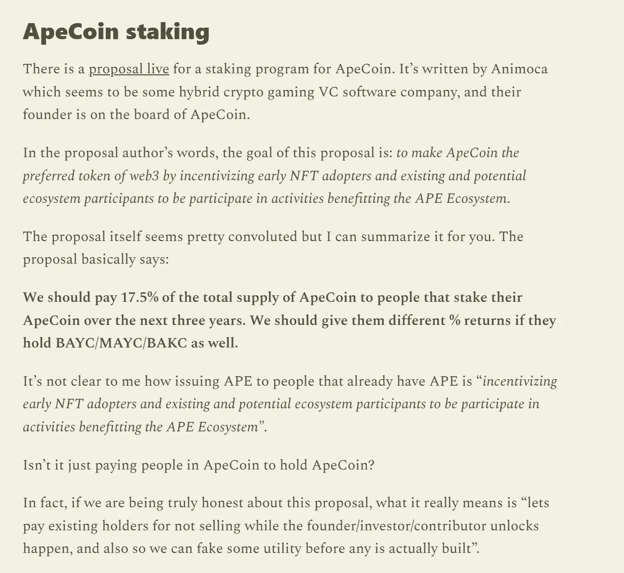 值得强调的是这也带来的风险。我们已经看到过类似结构在历史上出现严重问题的例子。请参阅 Cobie 文章中的这段节选:“ApeCoin 与质押的消亡