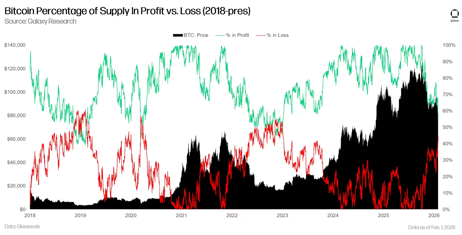 在 1 月 28 日至 1 月 31 日期间,比特币遭遇大幅下跌,跌幅达 15%,且跌势在周末进一步恶化。仅上周六当天,比特币就暴跌 10%,这一跌幅引发了期货交易平台历史上规模最大的清算事件之一,多头头寸清算金额超过 20 亿美元。同时,上周六比特币在 Coinbase 上的价格一度低至 75,644 美元,相较于美国 ETF 的平均成本基础 84,000 美元,跌幅超过 10%。此外,比特币价格还跌破了 Strategy 的平均成本价 76,037 美元,几乎触及一年来的低点 74,420 美元(该低点于 2025 年 4 月「关税风暴」期间创下)。目前,市场上有 46% 的比特币供应处于亏损状态,即这些比特币此前在链上转移时的价格高于当前价格。周六晚间收盘时,比特币更是自 2018 年以来首次出现连续四个月收跌的情况。