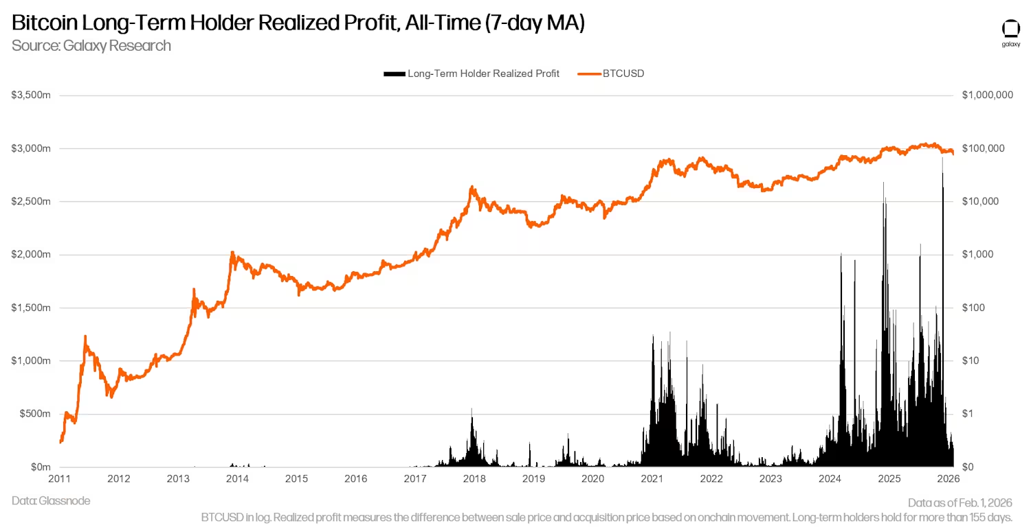 2024 年和 2025 年,比特币长期持有者的获利回吐规模(以美元计)超过了比特币历史上任何其他时期,2025 年平均每天的获利回吐金额高达 5 亿美元。虽然这种抛售潮最终有所缓解,但仍可能有更多长期持有者在等待更高的价格后再行抛售。未来长期持有者的进一步卖出仍可能对价格上涨构成阻力。不过,近期长期持有者已实现获利回吐的显著下降仍然值得关注,这表明市场可能正在接近周期底部(下图显示长期持有者已实现的获利回吐情况及其 7 日移动平均线)。
