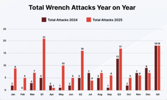 从财务影响看,2025 年已确认的扳手攻击相关损失超过 4,090 万美元,同比增长 44%。然而报告警告称,由于受害者报案意愿低、担心报复、部分资产涉及逃税或灰色地带等因素,这一数字仅是「冰山一角」。