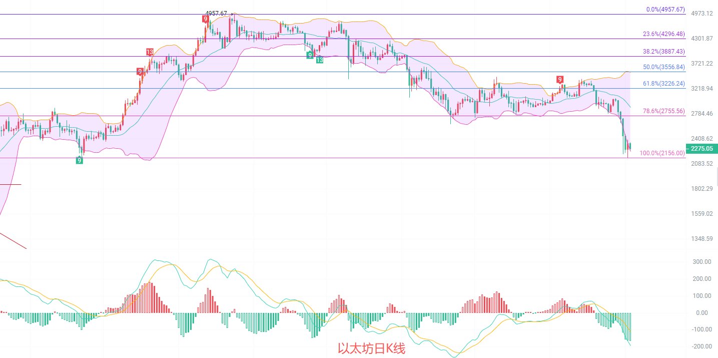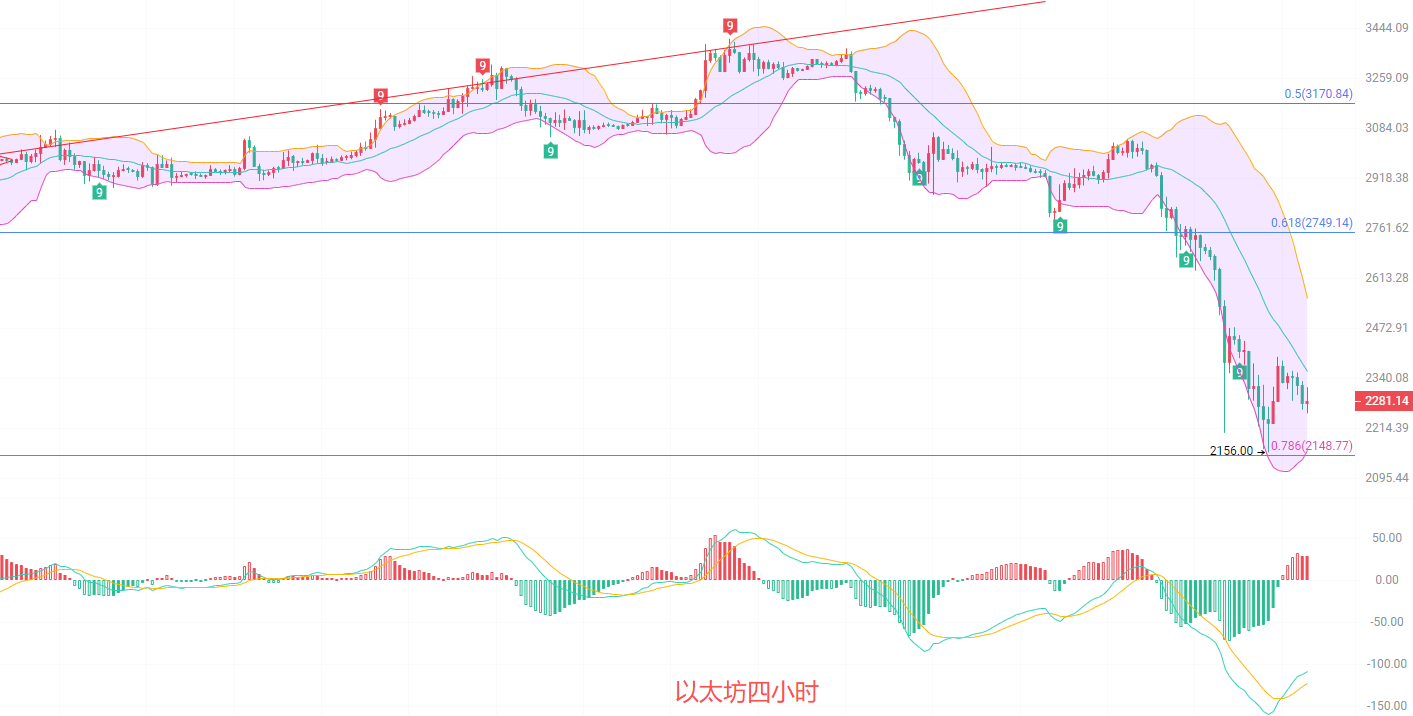 日K线发稿前最高2358,最低2250,EMA趋势指标向下开口扩散,EMA15抵达了2700,MACD缩量增筹南下趋势不变,DIF和DEA开始走出能量指标,说明行情有回调的需求,北上有空间,但是大级别是南下趋势,建议等回调压力南下为主,布林带下轨关注2245,整体趋势上急涨急跌行情结束,可以尝试做波段,空间在50到200点
