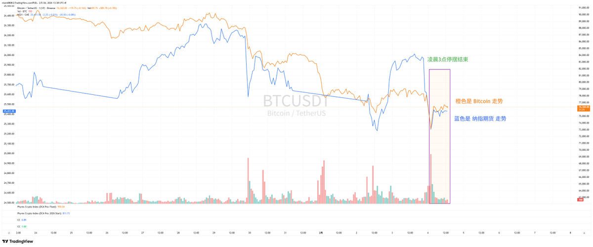 最近两天忙的像汪汪一样,生活不易啊。从目前的情况来看美国政府的停摆结束确实给市场回暖了,凌晨3点左右停摆完全结束后美股开始反弹,同时 Bitcoin 也出现反弹,可以从小时级别的 K线 走势中发现纳斯达克指数和 $BTC 同步性很高,由此可见凌晨作业的判断是正确的。