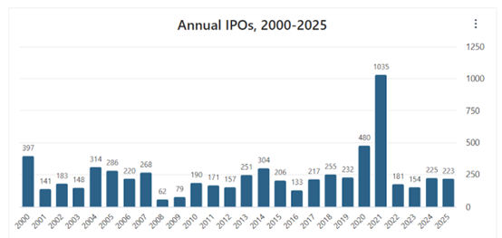 数据显示,2025 年全美共有 336 宗 IPO,其中 281 宗发生在纳斯达克,募资总额高达 700 亿美元。这一数据若置于过去二十年的长周期来看,仅有 5 个年份的 IPO 数量超过 300 宗,而 2025 年不仅位列其中,更呈现出一种在疫情后逐步攀升的稳健态势。