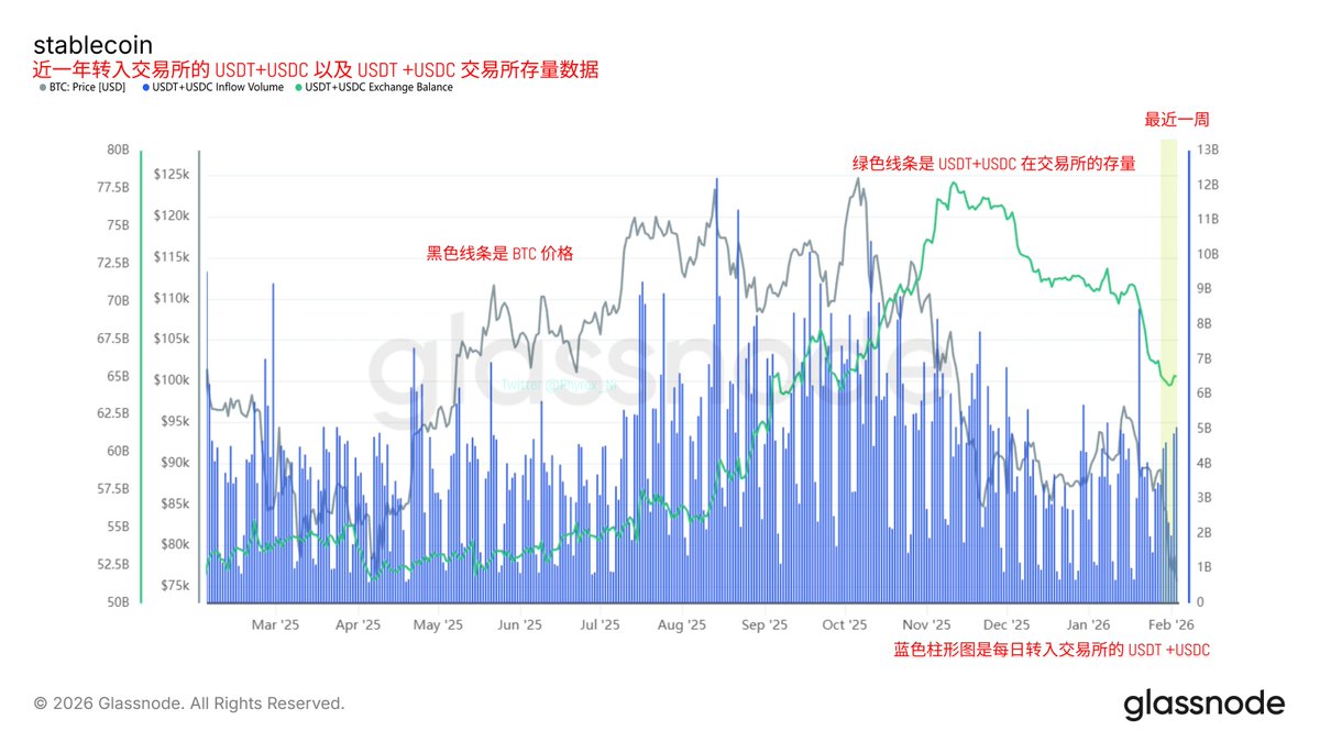 最近一年转入交易所的 USDT+USDC 以及 USDT +USDC 交易所存量数据