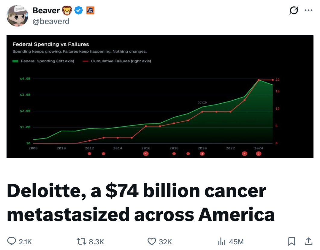 通过一篇文章就成为了百万富翁的创作者 X 账号名为 Beaver,其撰写的文章《Deloitte, a $74 billion cancer metastasized across America(德勤,一个价值 740 亿美元且已扩散至美国各地的癌症)》获得了 4500 万的浏览量。