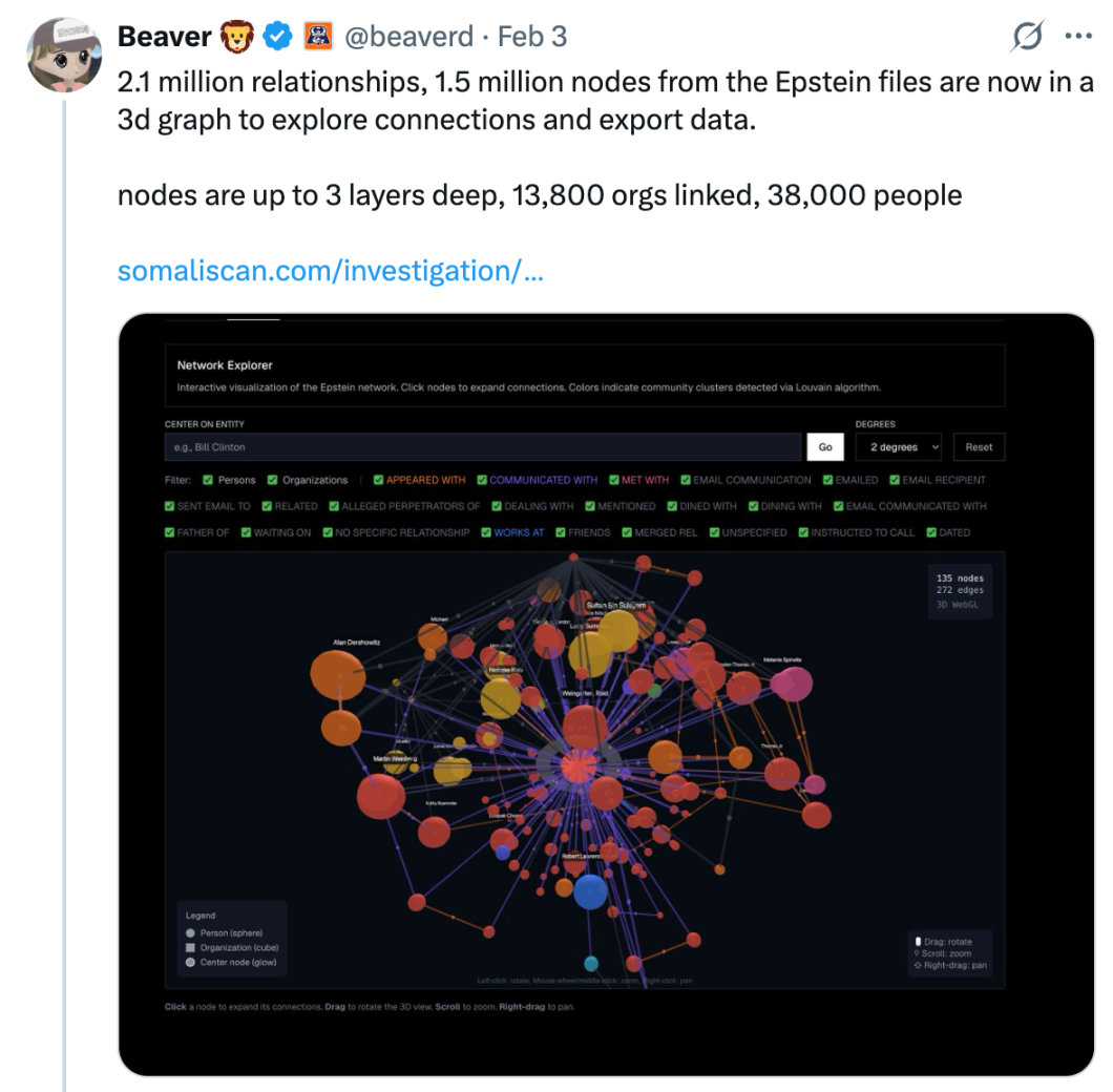就在 2 月 3 号,Beaver 还在网站上将公布的海量「爱泼斯坦文件」中的内容整理成了复杂的关系图。