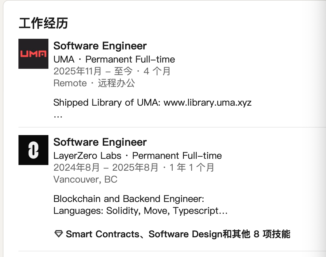 Alex并非加密圈的新面孔。公开资料显示,在2024年从英属哥伦比亚大学(UBC)毕业后,他就投身币圈。同年夏天,Alex加入LayerZero Labs担任区块链与后端工程师;2025年11月至今,他入职了DeFi项目UMA。