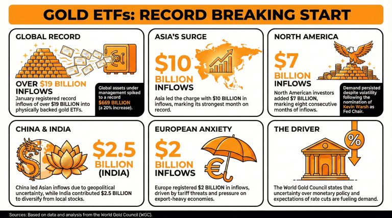 尽管市场波动,纸黄金市场依然强劲,1月份实物支持的黄金ETF资金流入创纪录,总计超过190亿美元。