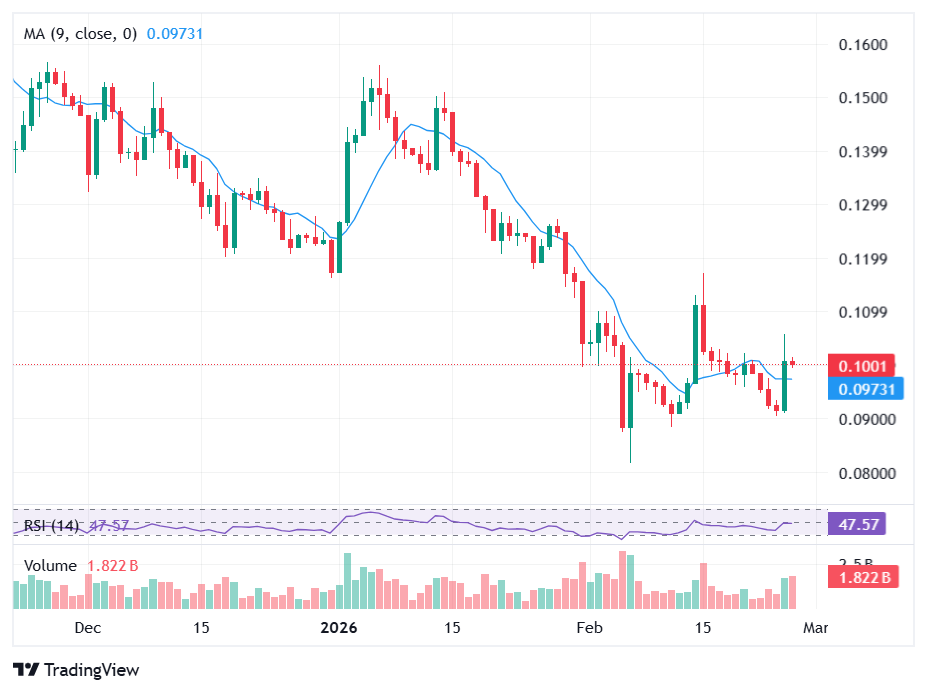 如果 DOGE 遭遇拒绝,由于市场参与者的疲惫可能会进一步下滑。截至撰写本文时,狗狗币的交易价格为 $0.09981,过去 24 小时内上涨了 8.93%。在持续波动性中,这个表情币略微削减了一些之前的收益。