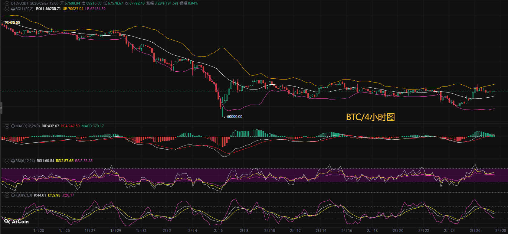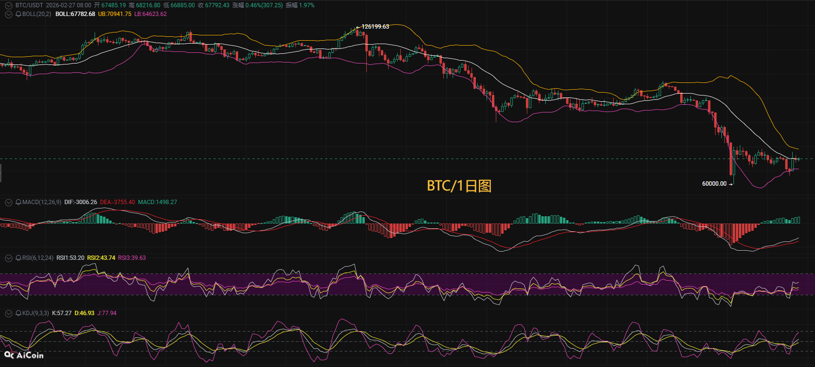 4小时级别来看近期出现长下影线探底66000一线后快速反弹,低位买盘强劲,当前价格突破前高68216.8后回落测试6700短线支撑;日线级别连续3天收阳并站上EMA7(67156),但上方69215(EMA120)存在强压,短期可能进入震荡。从技术指标看,4小时级别DIF(441)上穿DEA(249)且柱状线放大,EMA7(67615)上穿EMA30(66853),但价格仍低于EMA120(69215),呈短多中空格局;日线级别MACD仍处零轴下方但金叉初现,走势相对来看还是偏向弱势,目前整体走势依旧一个宽幅震荡,上方压制关注在69200一线,下方支撑关注66000一线,走势没有突破之前,切勿追涨杀跌。