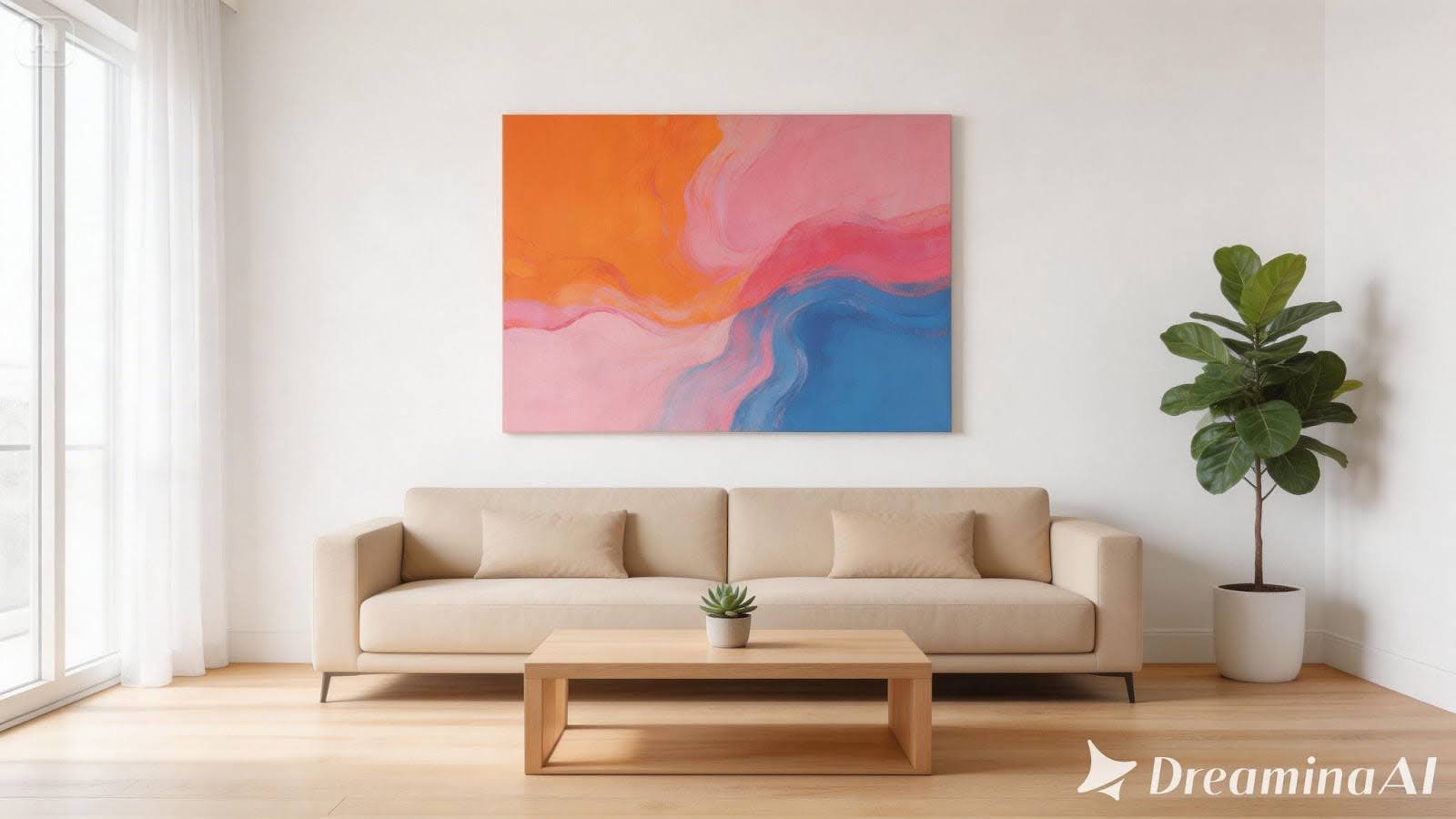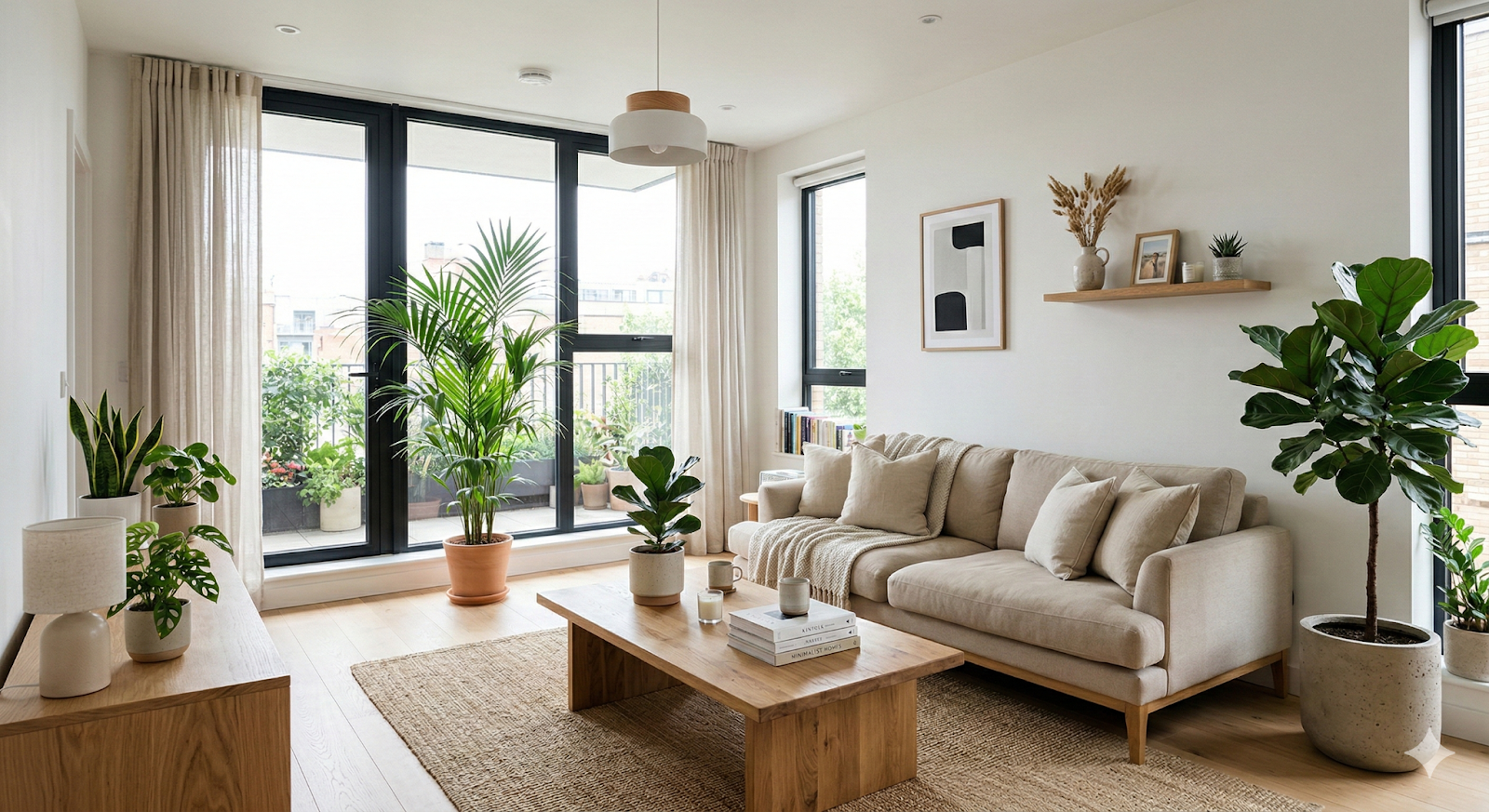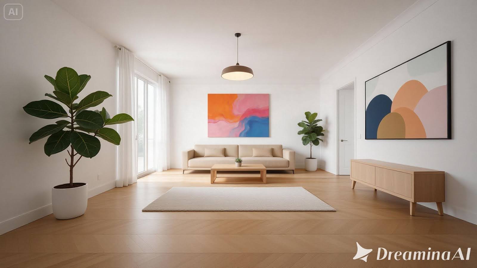 提示指定了白色墙壁、米色沙发、木质咖啡桌和室内植物——一个简单明了的简要说明,具有明确的建筑参数。