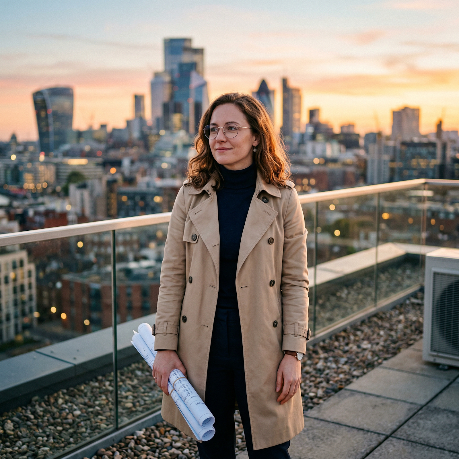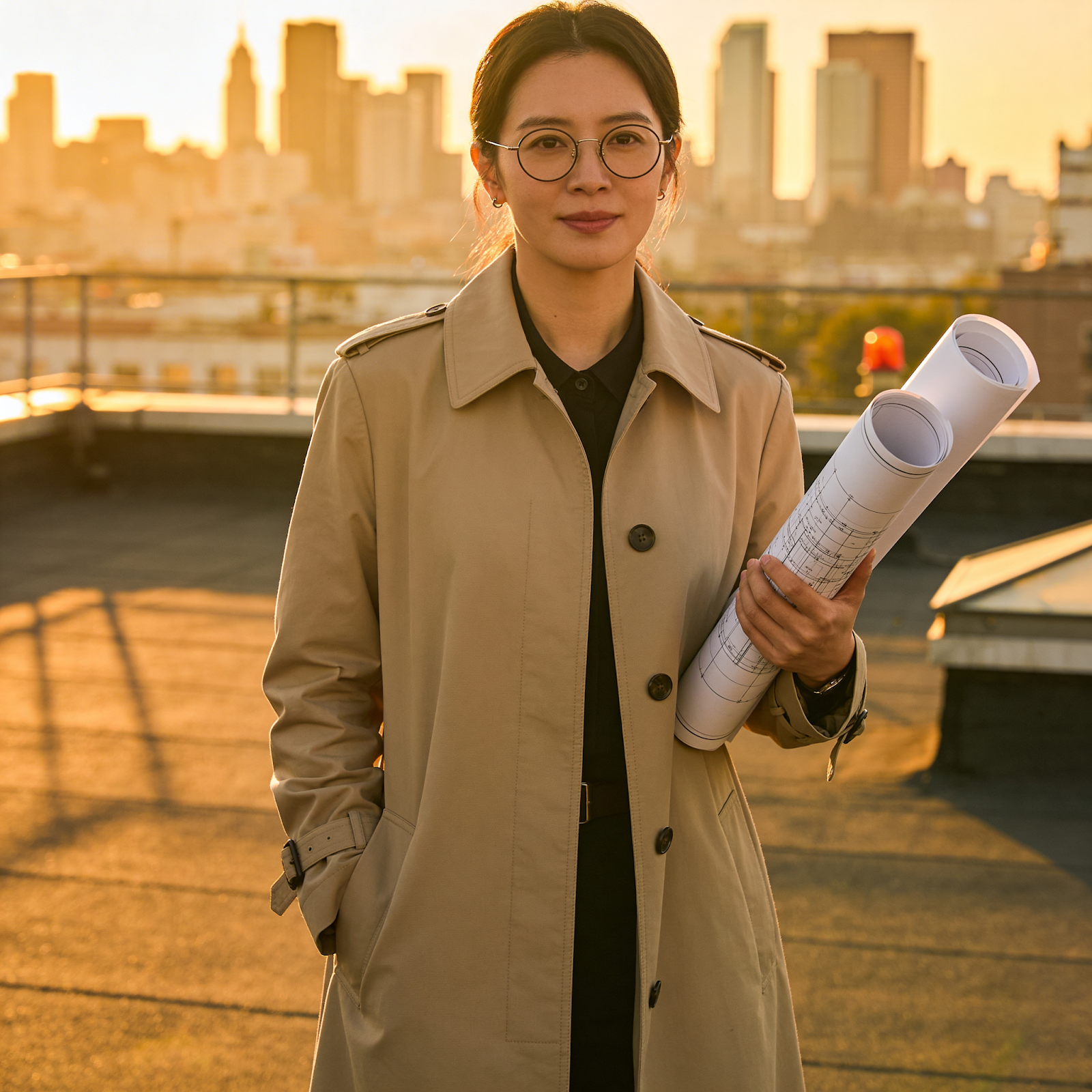 简要说明:在日落时分,一位 32 岁的女建筑师穿着米色风衣和圆形眼镜,左手持卷装蓝图,站在屋顶上,城市天际线在背景中略微模糊,金色时光光照下伴随柔和的边缘光,模拟 50mm 镜头的浅景深,纵向 4:5 的长宽比,现实的皮肤纹理,细微的胶卷颗粒。列表中的每个元素都是一个独立的约束。