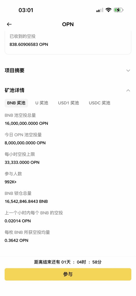 按照现在的数据来看,每一枚 $BNB 在活动期间能带来 0.3642 枚 OPN,一千枚 BNB 就是 364.2 枚,合约现在是不到 0.5 美元一枚,即便是上现货拉一倍到一美元,那么一千枚 BNB 的收益也就是 364.2 美元。