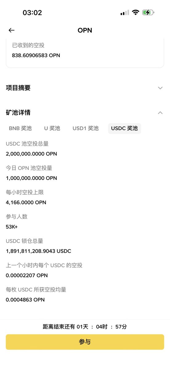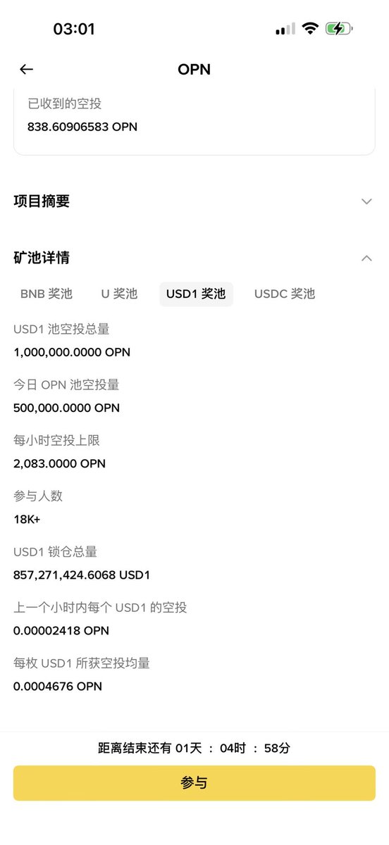 其次就是 USD1 ,USD1 最近在 #Binance 有为期一个月的理财收益,很多小伙伴都在撸,总资金量来到了 8.5亿 美元,按照 100万 美元的 USD1 来说能拿到 467.6 枚 OPN ,而且还能享受 USD1 的空投,实际收益可能是最高的。