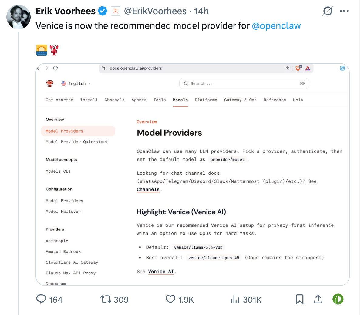 OpenClaw 当前选择的模型提供商达 22 家,其中包括 Amazon、Anthropic、Cloudflare 等大型科技公司。从体量和品牌来看,Venice 显然不是最显眼的那一个,甚至可以说是最不起眼的。但它却曾在官方文档中被高亮推荐且带有原生 Token 经济的模型提供商。不过,也有可能是文档合并误操作,目前该高亮已经移除,但它却在更早时间便已进入 OpenClaw 的模型提供商名单。