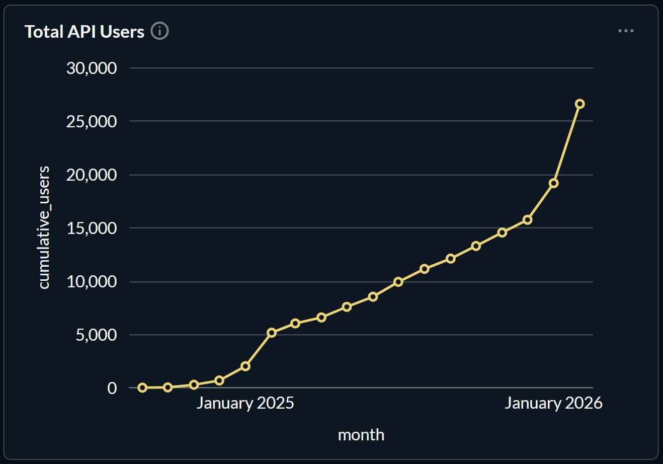 从 Erik 在 3 月 1 日公布的最新数据来看,进入 2026 年以来,Venice 的 API 用户数开始出现迅猛增长,目前用户已超过 25000 名。