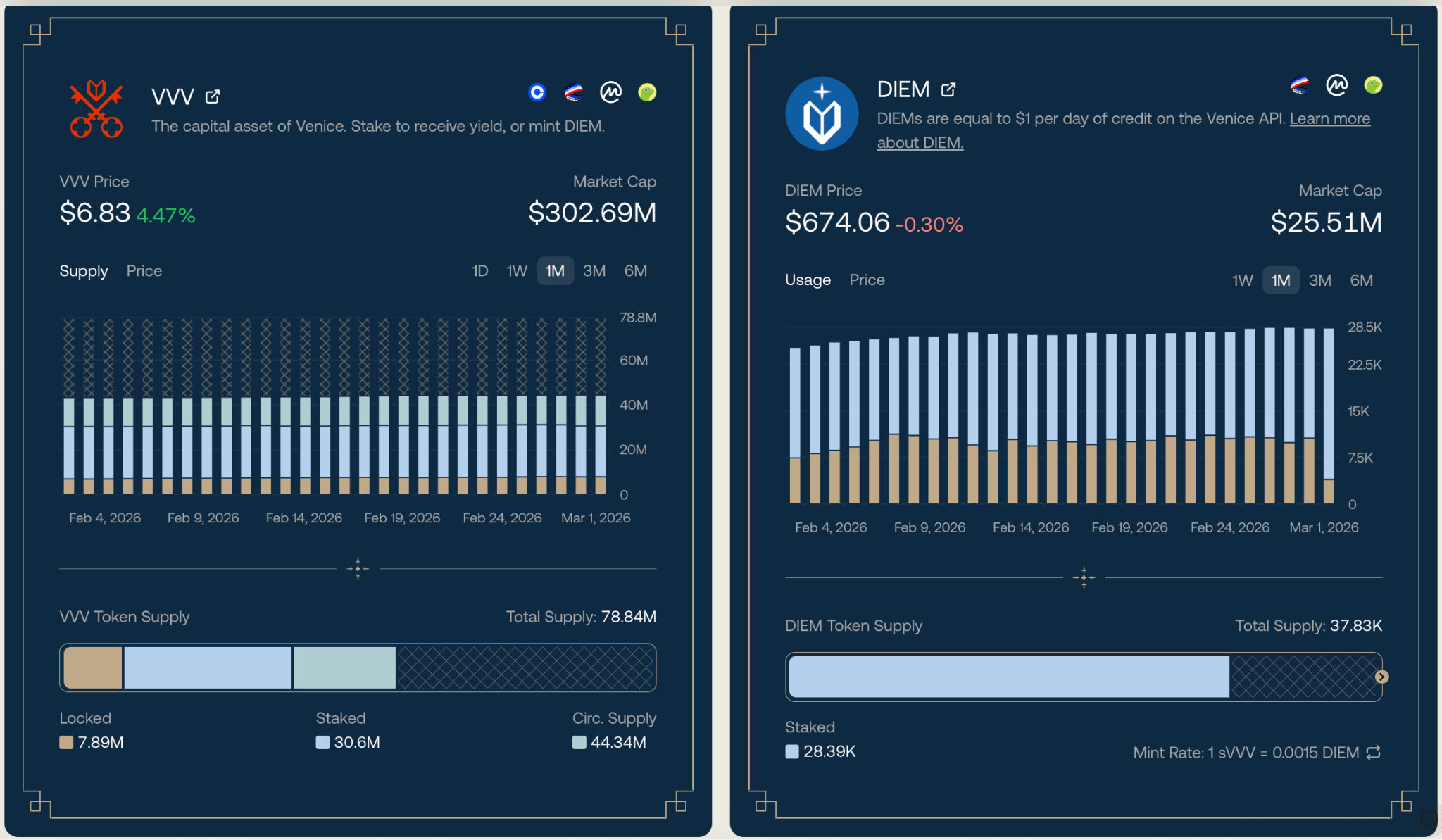 在 Venice 生态里,有两个核心 Token:VVVDIEM。它们正通过“单向铸造 + 可逆赎回”机制紧密绑定,形成一个双层经济结构。