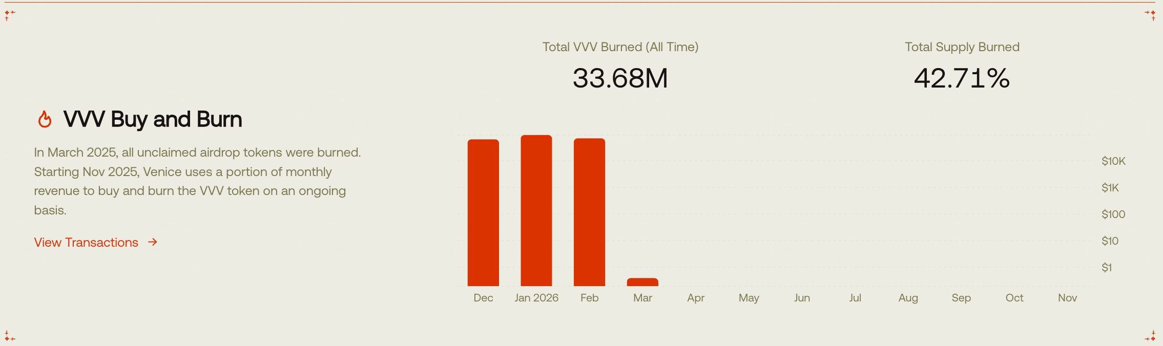 自 2025 年 10 月开始,Venice 宣布将原排放计划 1 千万枚 VVV/年削减至 800 万枚/年,同时启动了月度营收回购+销毁机制,当前月度销毁能力在3万~5万枚,价值约6万~9万美元。当前,42.71%的代币供应已经被销毁。而在 2026 年 2 月初,官方再一次宣布排放削减计划,将 800 万枚 VVV/年削减至 600 万枚/年,这一系列调整,直接改变了供应预期。从代币价格表现来看,这也是 VVV 的起涨点。