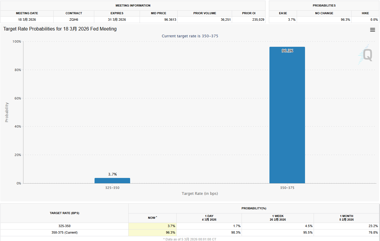 ● 目前,芝商所的FedWatch工具显示,3月维持利率不变的概率已超过97%。那个曾经让市场魂牵梦绕的“3月降息”,在战火和数据的双重夹击下,基本宣告归零。
