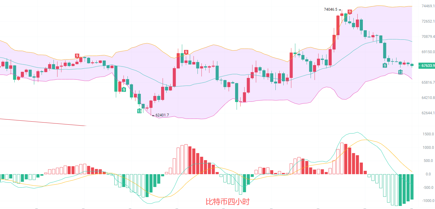 四小时K线从74000一路南下了6000点,EMA趋势指标原本向上交替扩散的大好局面被扳回收缩到了69000一线,MACD缩量减少,DIF和DEA在0轴线形成两极分化,布林带中规阻力在7万关口,下轨来到了66000,短线行情一直游走在极端超卖边缘,主力有可能真空,也有很大概率诱空,所以在68000一线有必要北上试仓,思路用昨日一样不变