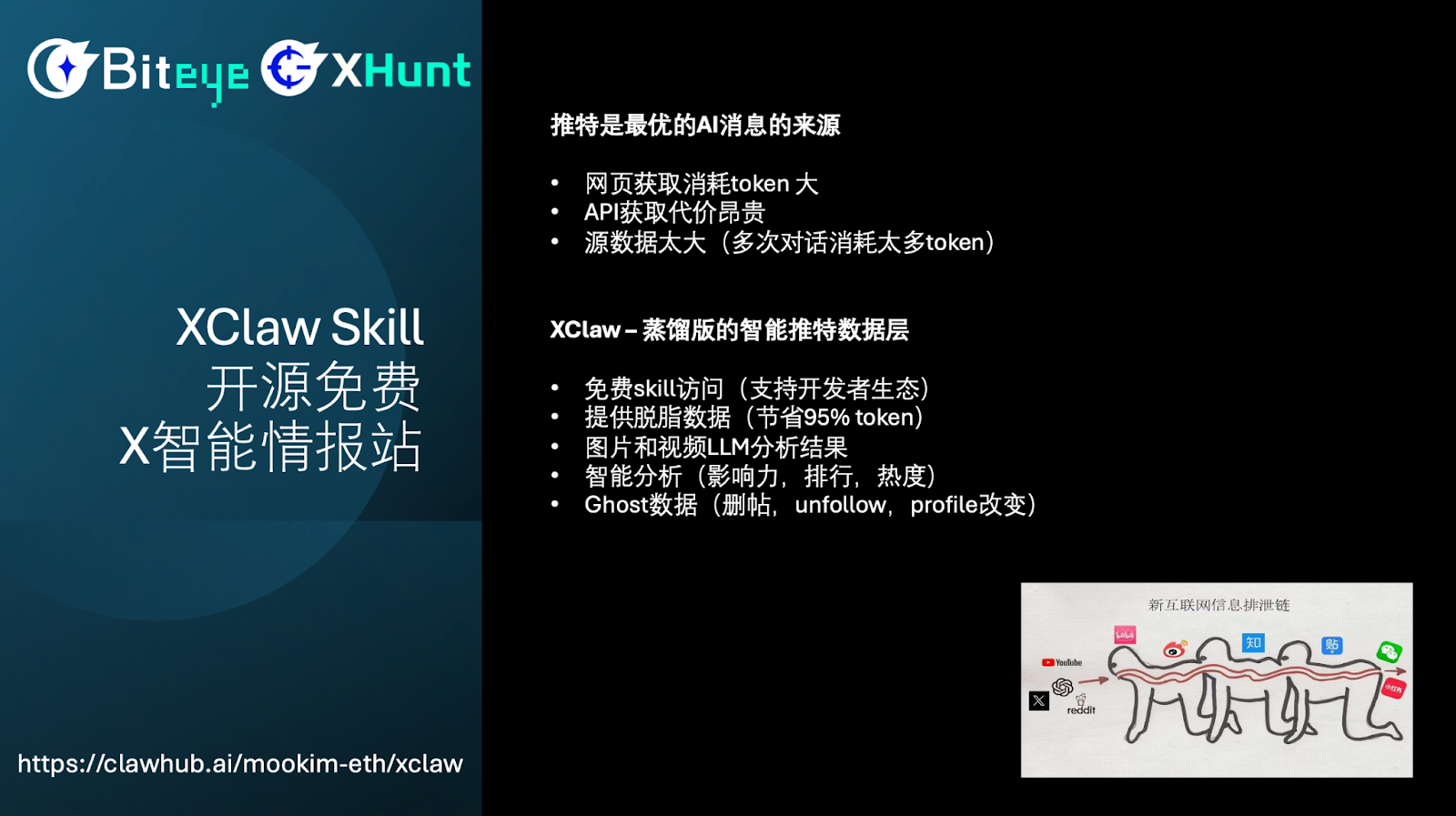 接下来我想重点介绍一下我们的 XClaw Skill。推特是目前最优的 AI 消息来源,大家也可以通过这张图看到,很多时候大家从微信和小红书看到的信息,其实已经在推特上发酵了几个小时了。