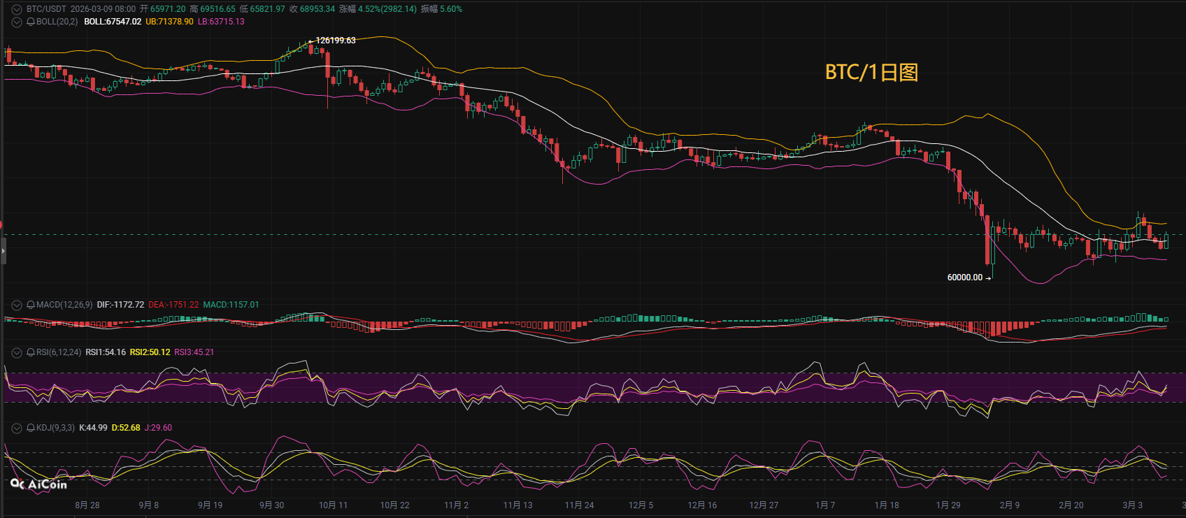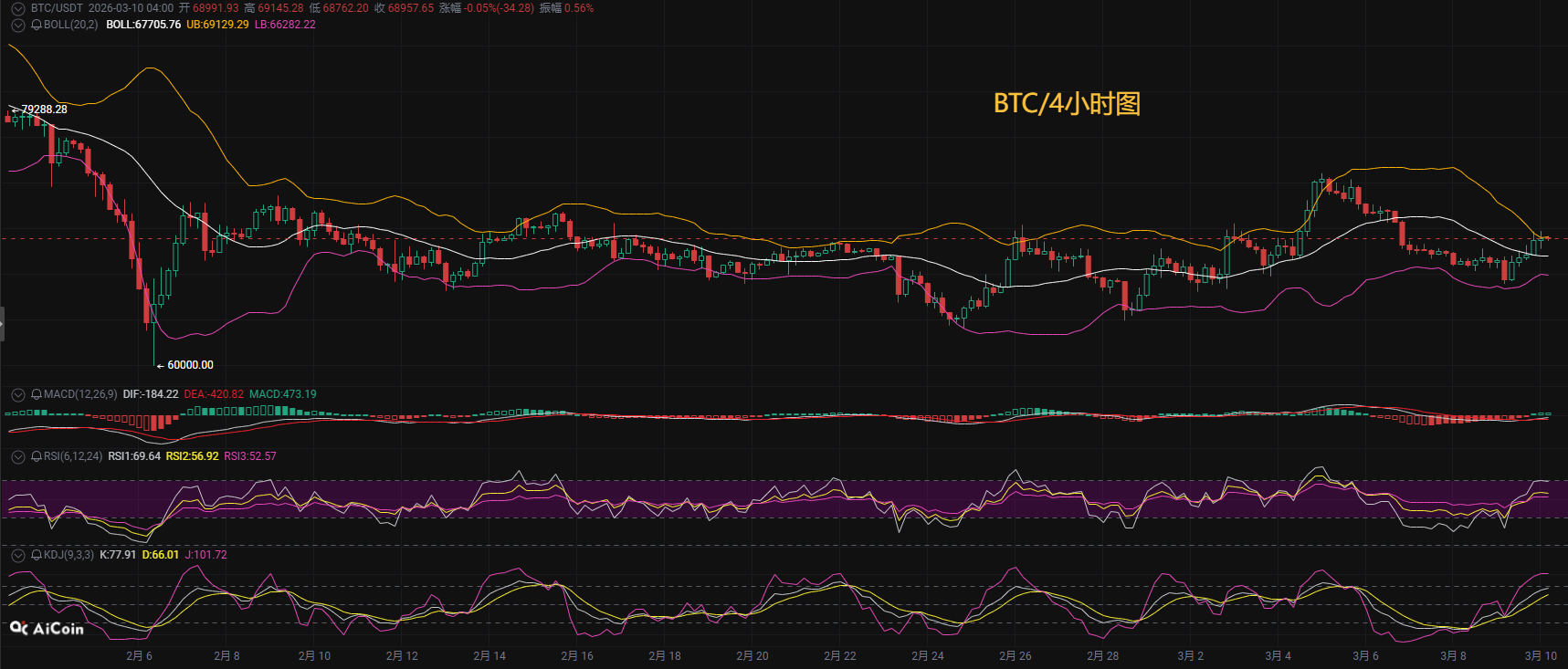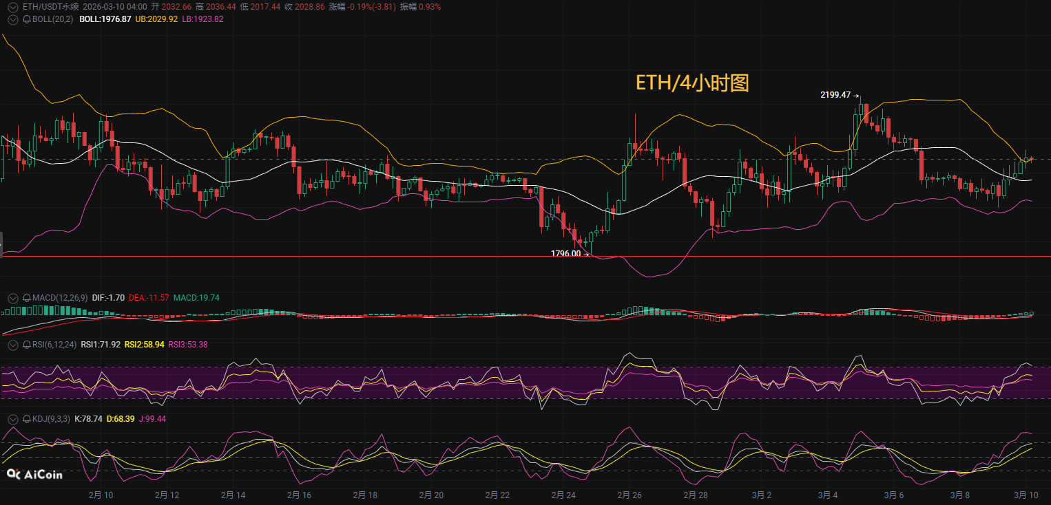 日线级别在3月9日形成锤子线后延续反弹走势,短期低点65821美元成为关键支撑位。技术指标来看,4小时MACD虽已形成金叉并持续放量,但DIF指标(182)仍处于零轴下方;日线级别MACD死叉形态尚未改变。目前没有之破前整体走势算是一个宽幅震荡,上方压制关注7万一线突破和企稳情况,下方支撑关注67500一线,