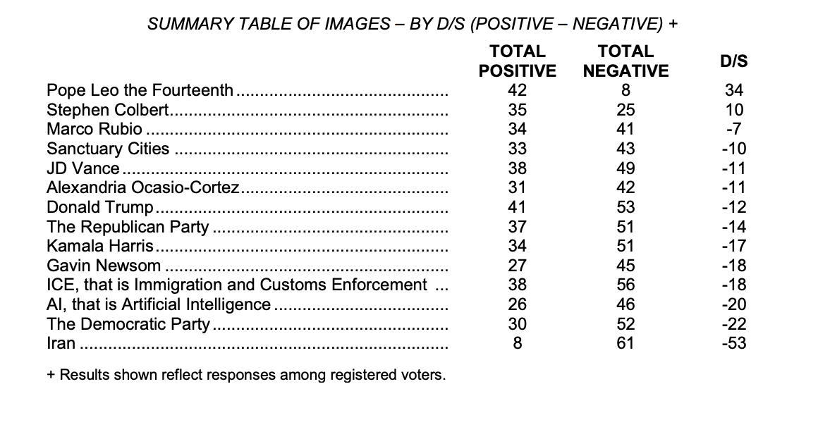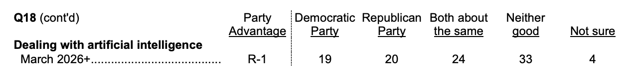 人工智能的净支持率低于移民和海关执法局的-18,低于共和党的-14,特朗普总统的-12,卡马拉·哈里斯的-17,以及加利福尼亚州州长加文·纽森的-18。