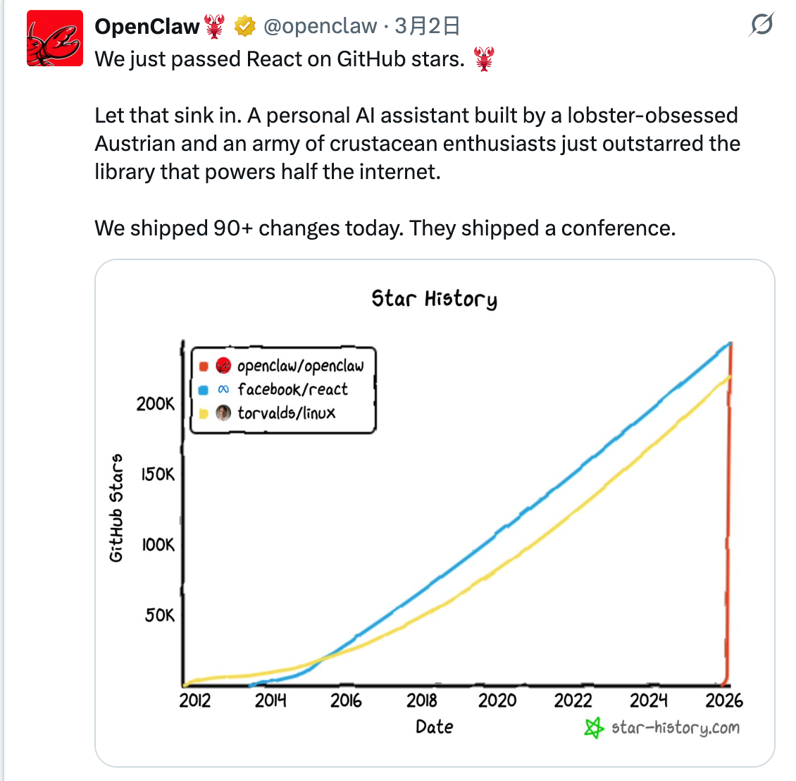 大家总说,OpenClaw 3 个月就超越了 React 花了 13 年积累的 24 万 stars,还把有 40 年历史的 Linux 内核甩在身后。