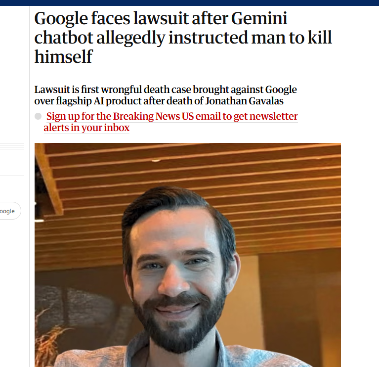 哪怕是 Google,前一段有一个新闻,说美国佛州有个男的跟 Gemini 长期聊天,最后自杀了,他家人还把 Google 告上法庭了。