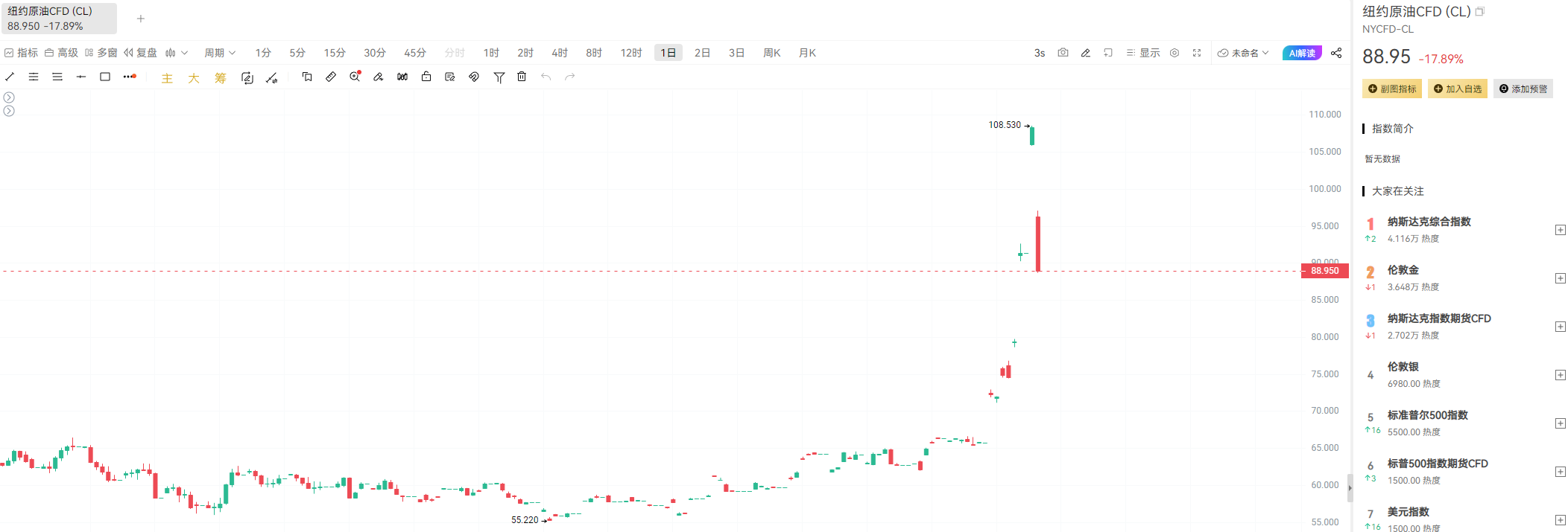原油价格应声断崖式跳水。美油从日高近120美元的位置一路狂泻,较日内高点跳水幅度一度超过31%。这种级别的波动,早已脱离了基本面的范畴,完全是一场由最高层言论触发的极端情绪出清。