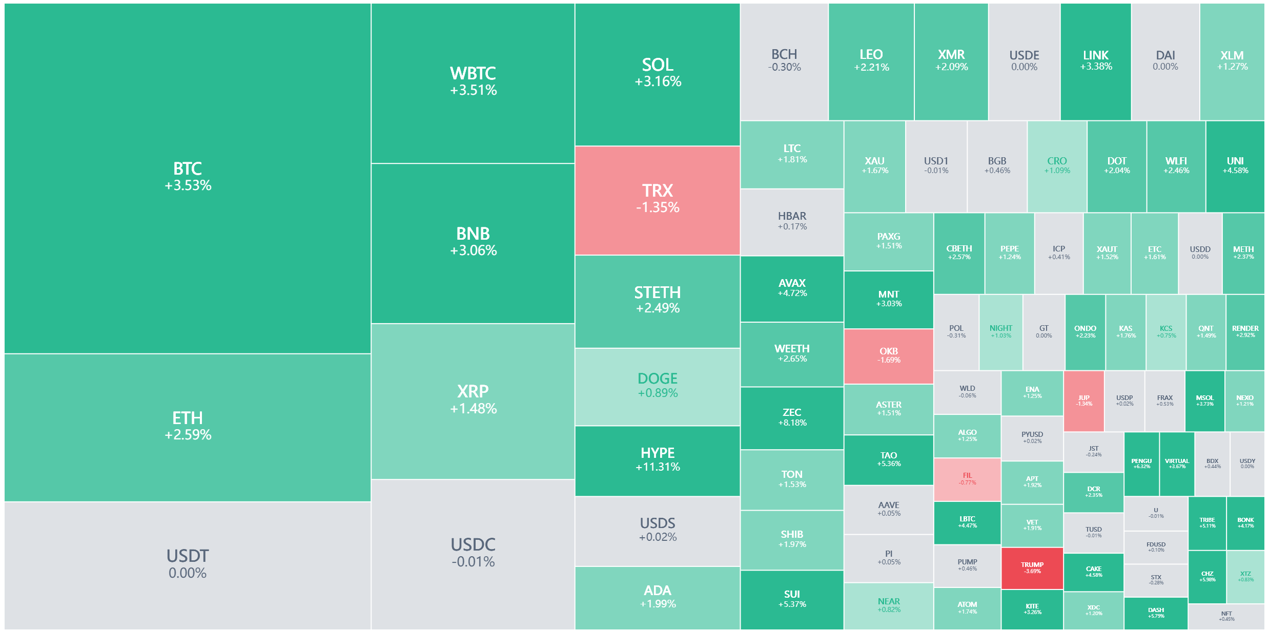 周一早些时候,当原油狂飙、美股暴跌时,比特币跟随风险资产一度承压。然而,随着特朗普的讲话和市场的反转,比特币不仅收复了周末的失地,更是在当天录得了稳健的涨幅。数据显示,比特币日内上涨2.63%,以太坊涨幅超过3.4%。甚至在周二亚市早盘,比特币一度突破69000美元关口。