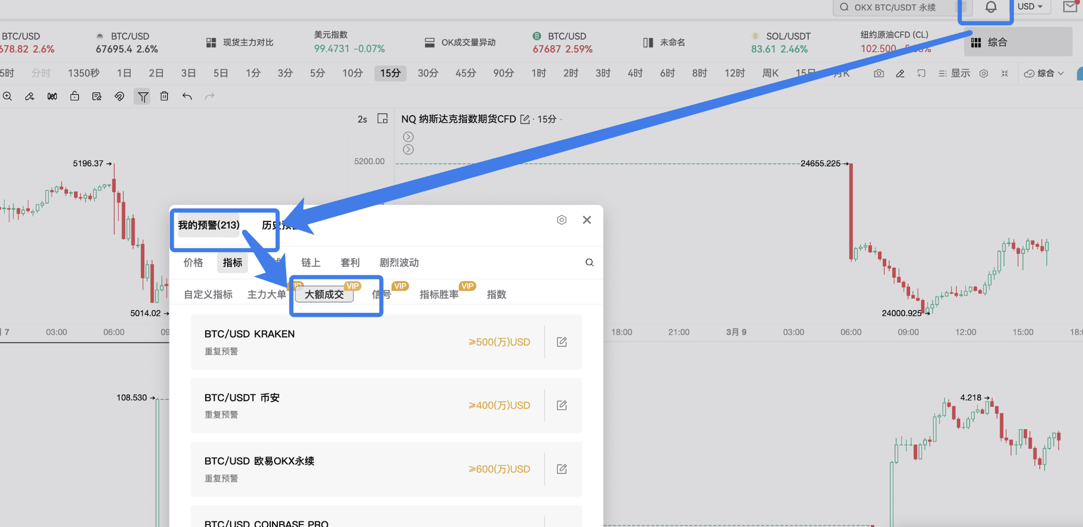 只需要改一下标识码:okx_btc_symbol = 'btcusdt:okex',这是会员专属功能,支持预警、绘图、实盘同步。