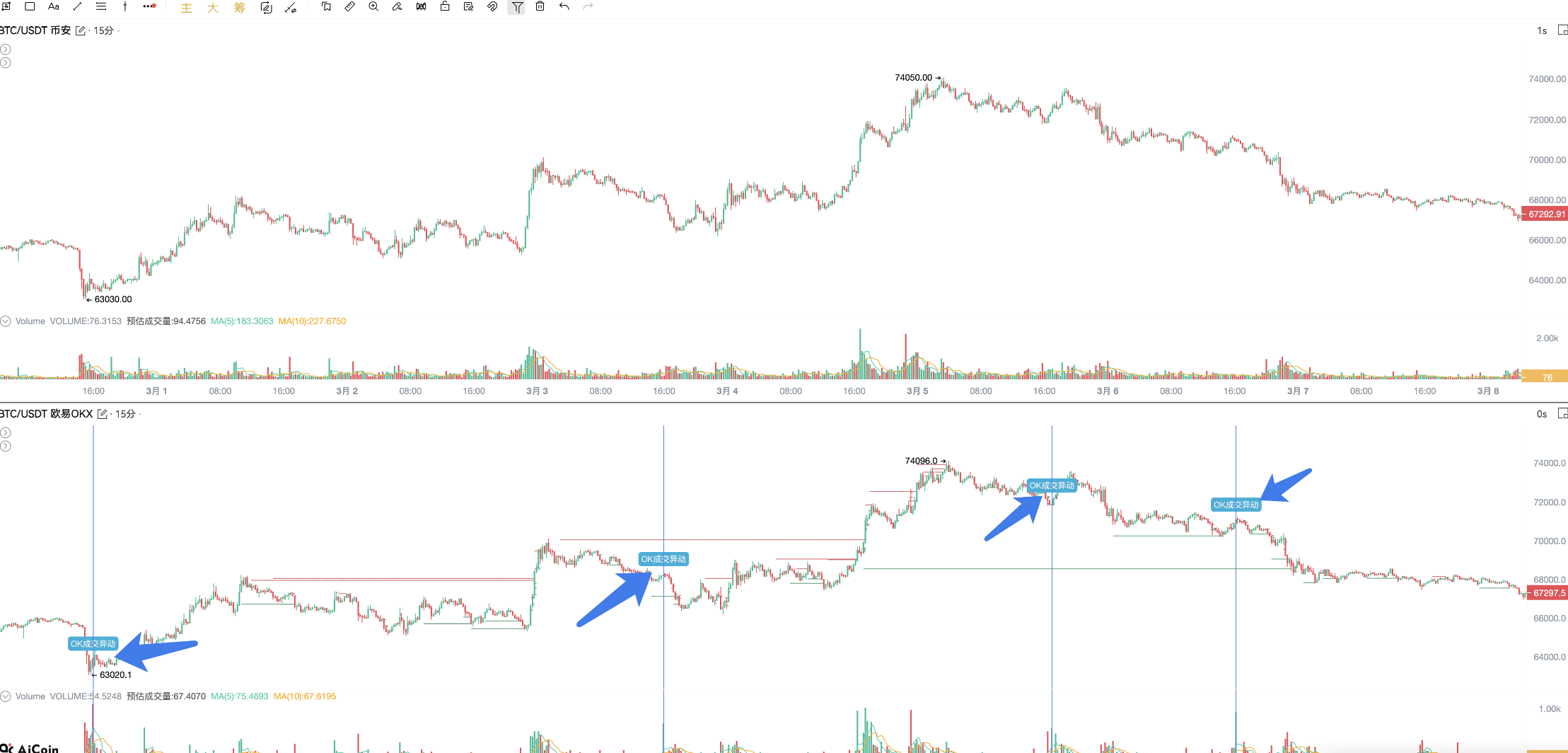 最近一两个月,OKX 的 BTC 成交量,经常在这个时间段突然异动放量,而且币安等其他平台成交量完全没跟上。
