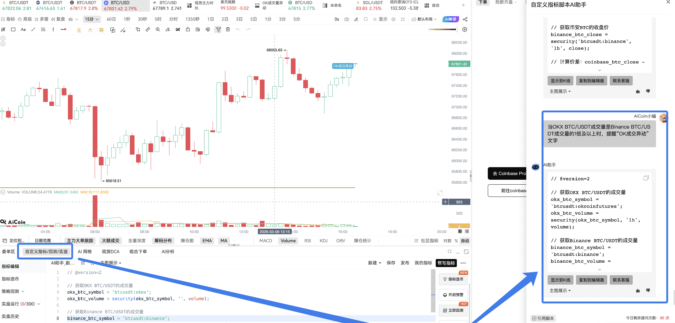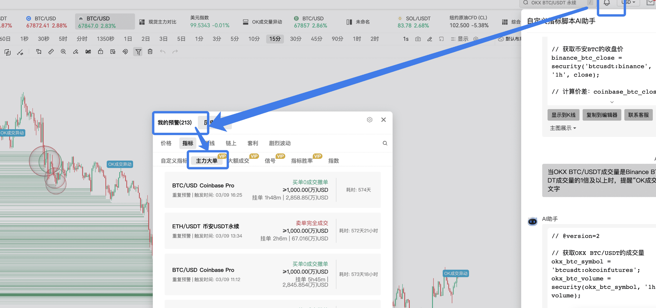 想自己跟踪这个信号的朋友,用自定义指标就能实现,我截图里的 “OK 成交异动” 文字提醒,就是 AI 写指标做的。