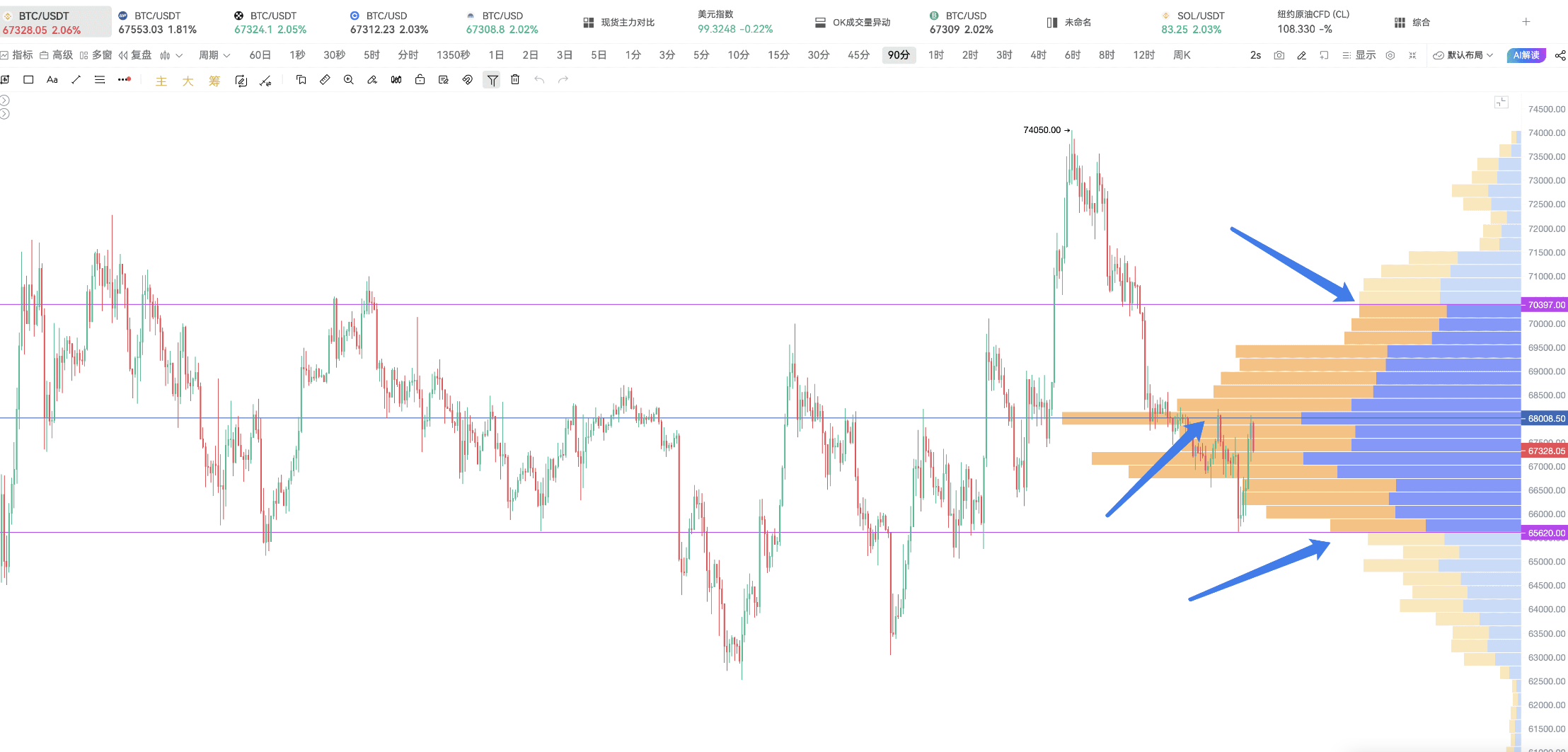 我看的是币安 BTC/USDT 现货近一个月的筹码峰,做短期合约的朋友,可以看永续合约 + 更短周期的筹码。\