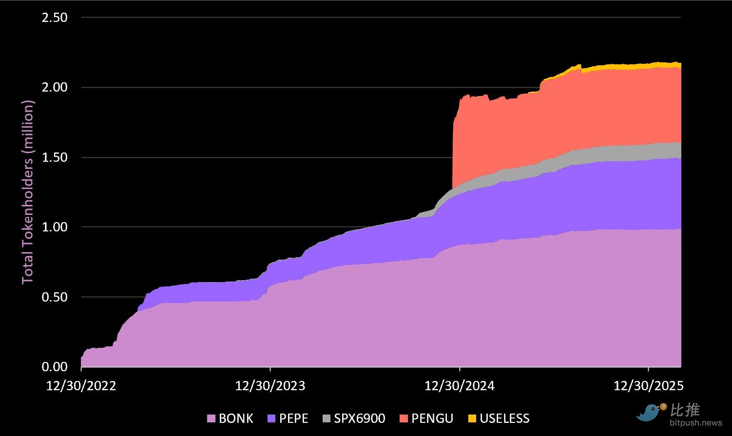 PENGU: 53.41 万持有者(较峰值下降 14%)。PENGU 于 24 年 12 月推出,代表了对热门品牌 Pudgy Penguin(胖企鹅)的社交兴趣。如今 Pudgy Penguin NFT 系列的总市值约为 7850 万美元,而其迷因币市值则为 4.54 亿美元(是 NFT 系列的 5.7 倍,较 27 亿美元的巅峰有所回落)。我们认为 Pudgy Penguin 品牌(一个打入主流的强势加密品牌)的价值很可能会继续流向该迷因币。