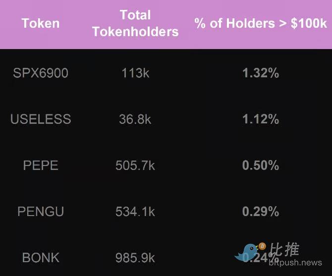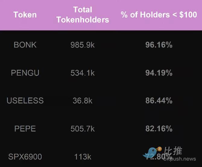 BONK: 98.59 万当前持有者(正处于持有量巅峰)。BONK 于 22 年 12 月推出,是 Solana 生态中最大的迷因币,深入集成在各类应用和钱包中。注意,BONK 执行过社区驱动的空投活动,向大量钱包「播撒」,这体现在下表的数据中。