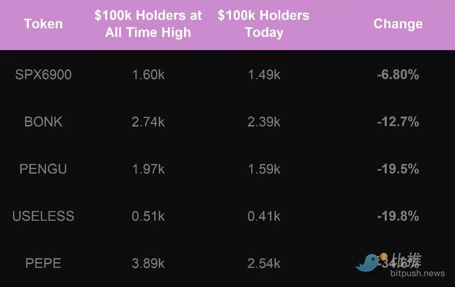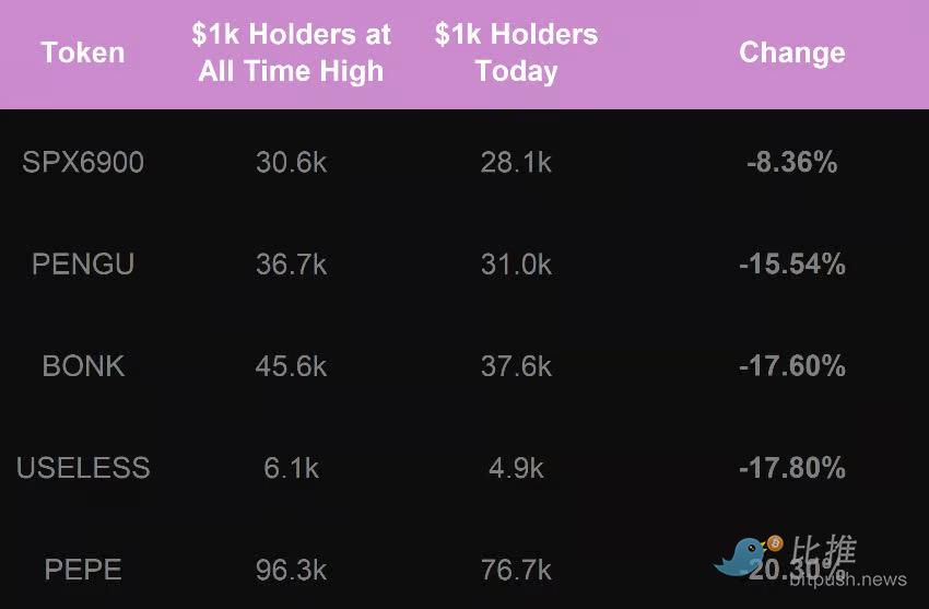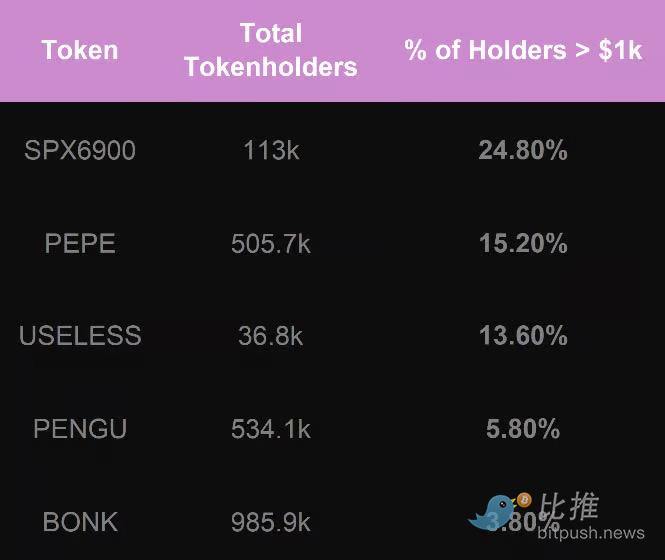 BONK、PENGU 和 PEPE 已经拥有了非常成熟的持有者基础。SPX6900 则展现出一个更坚定、更忠诚的持有者基础(尽管规模较小)。